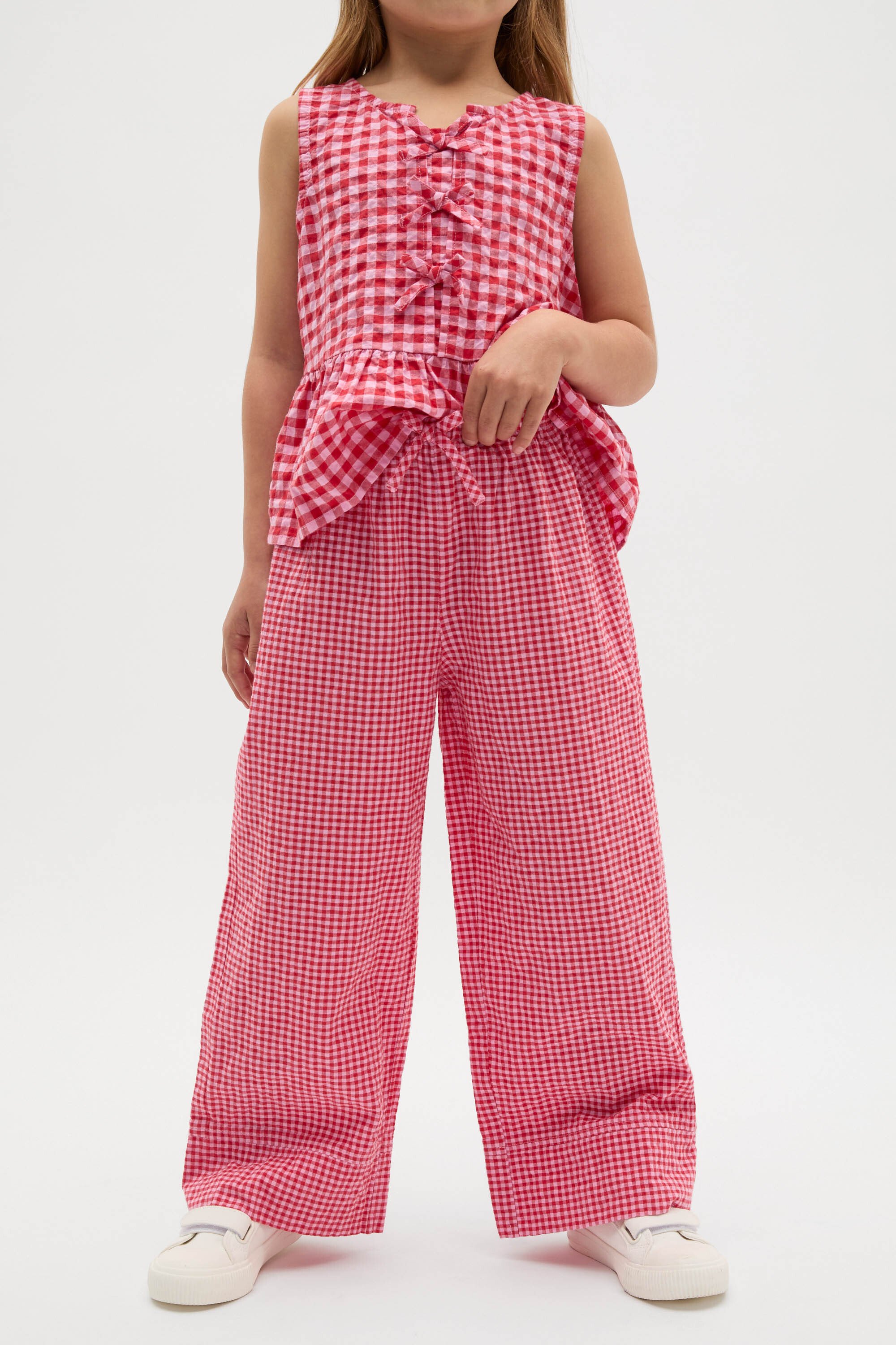Comfortable and sweet, these gingham pants are a playful addition to her rotation. Crafted in premium cotton, they feature an elasticated waistband with a drawstring and a straight leg shape. Pair with the matching gingham styles for the sweetest coordinated set.