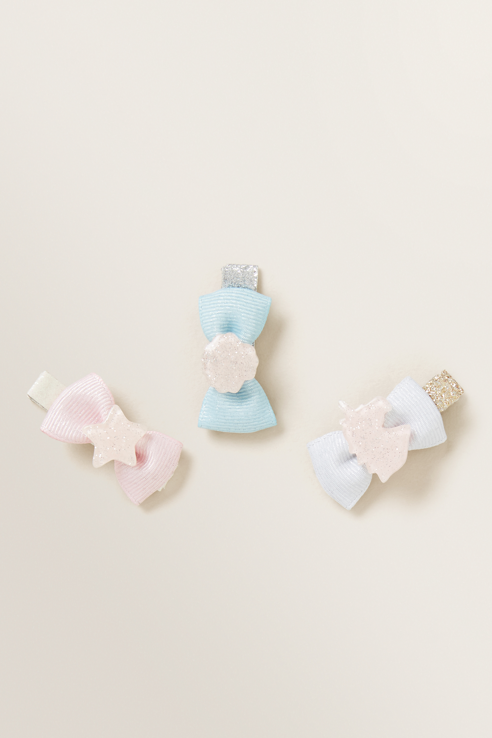 This Glitter Bow 3 Pack features a grosgrain ribbon bow, glitter motif and a secure duck clip.