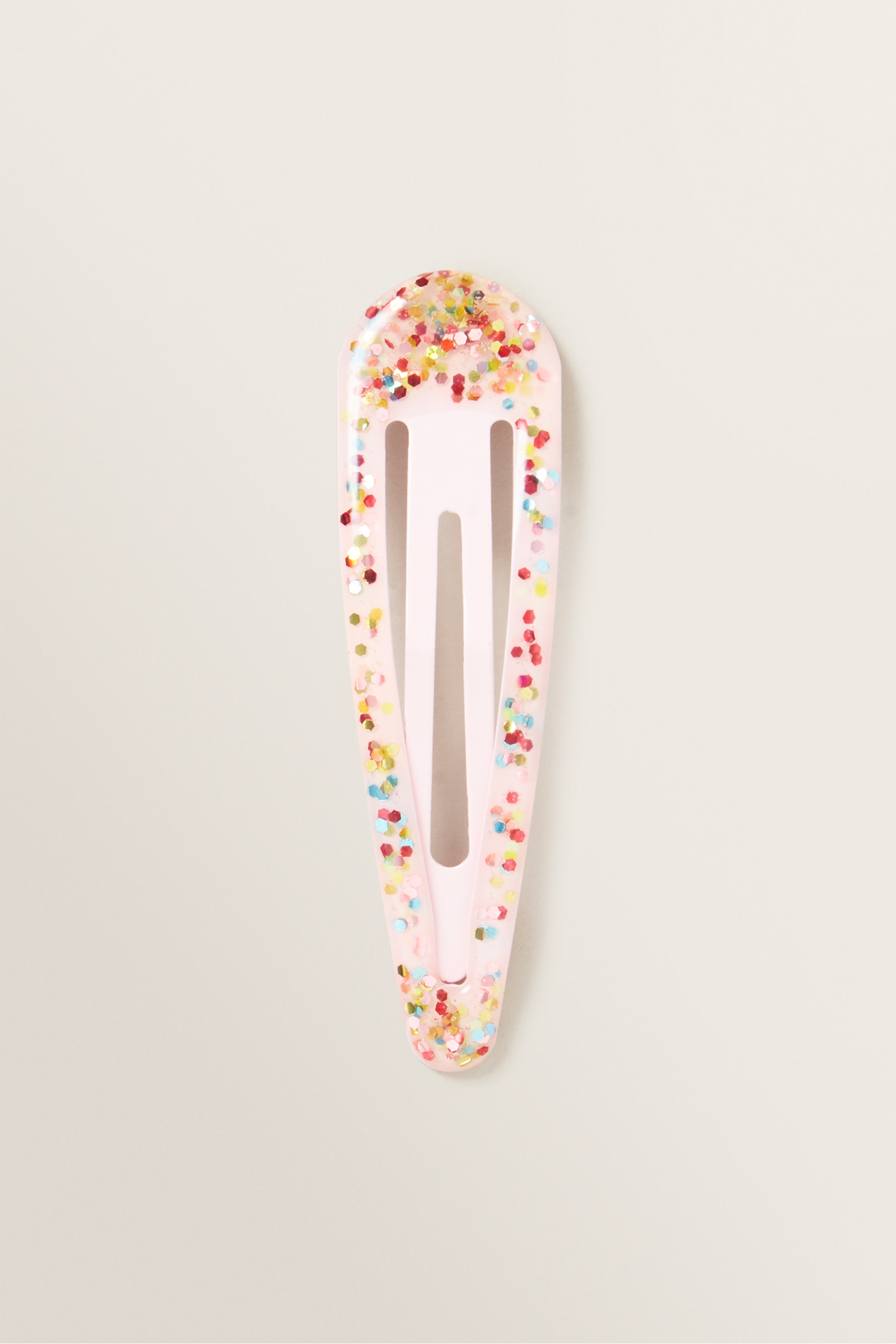 Pin back summer locks, with this Glitter Snap. Featuring a lustrous exterior, this clip is detailed with a soft snap closure. This is not a toy. Potential choking hazard. Not recommended for children 3 years and under.