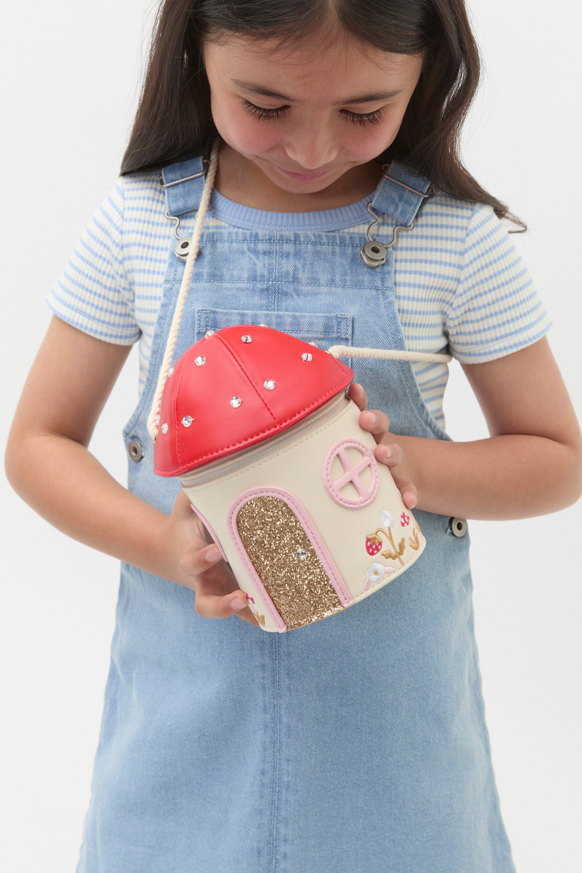 Playful and cute, her imagination will run wild with this bag, crafted in the shape of the sweetest little gnome house. It features applique windows with a glitter door and embroidered flowers.