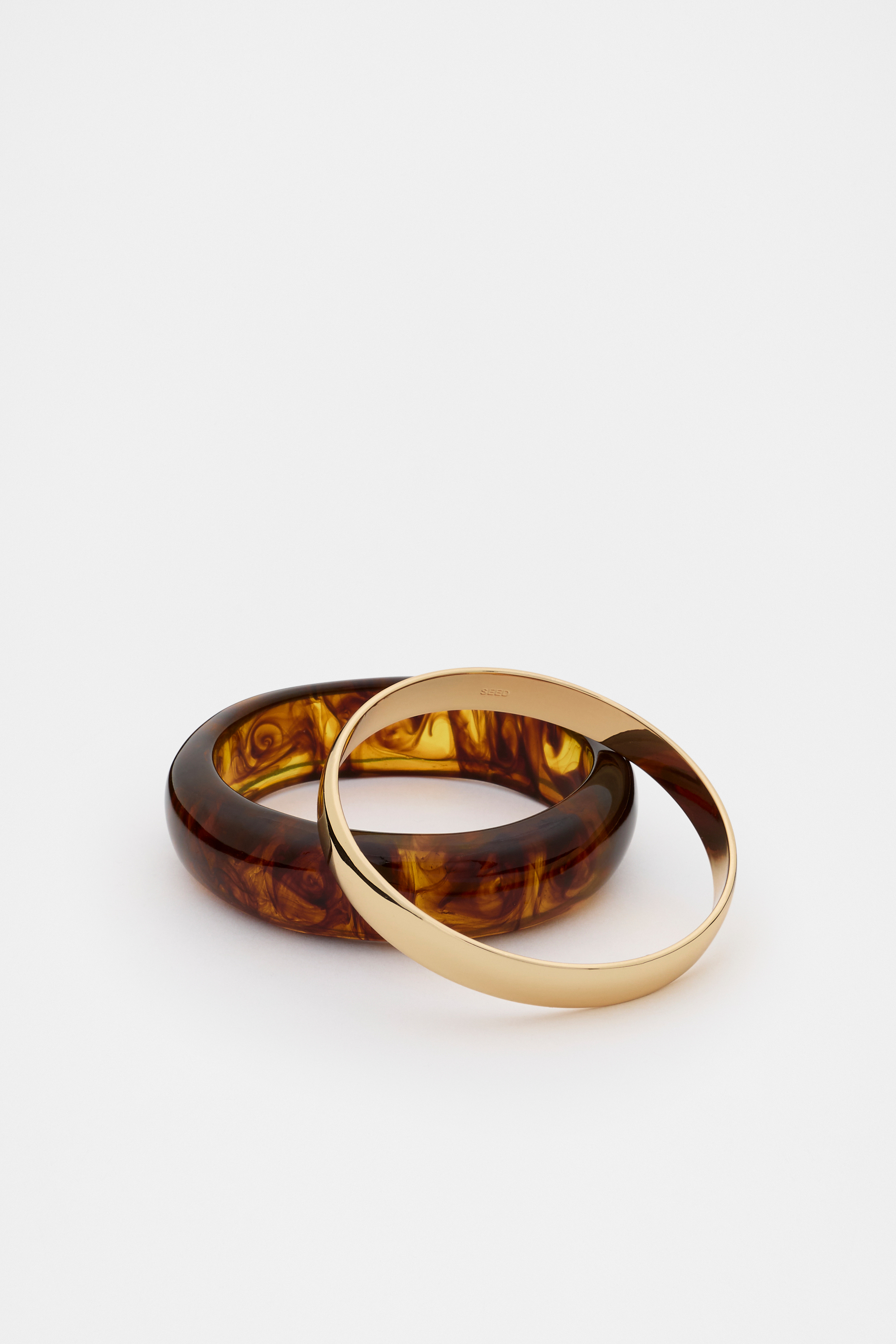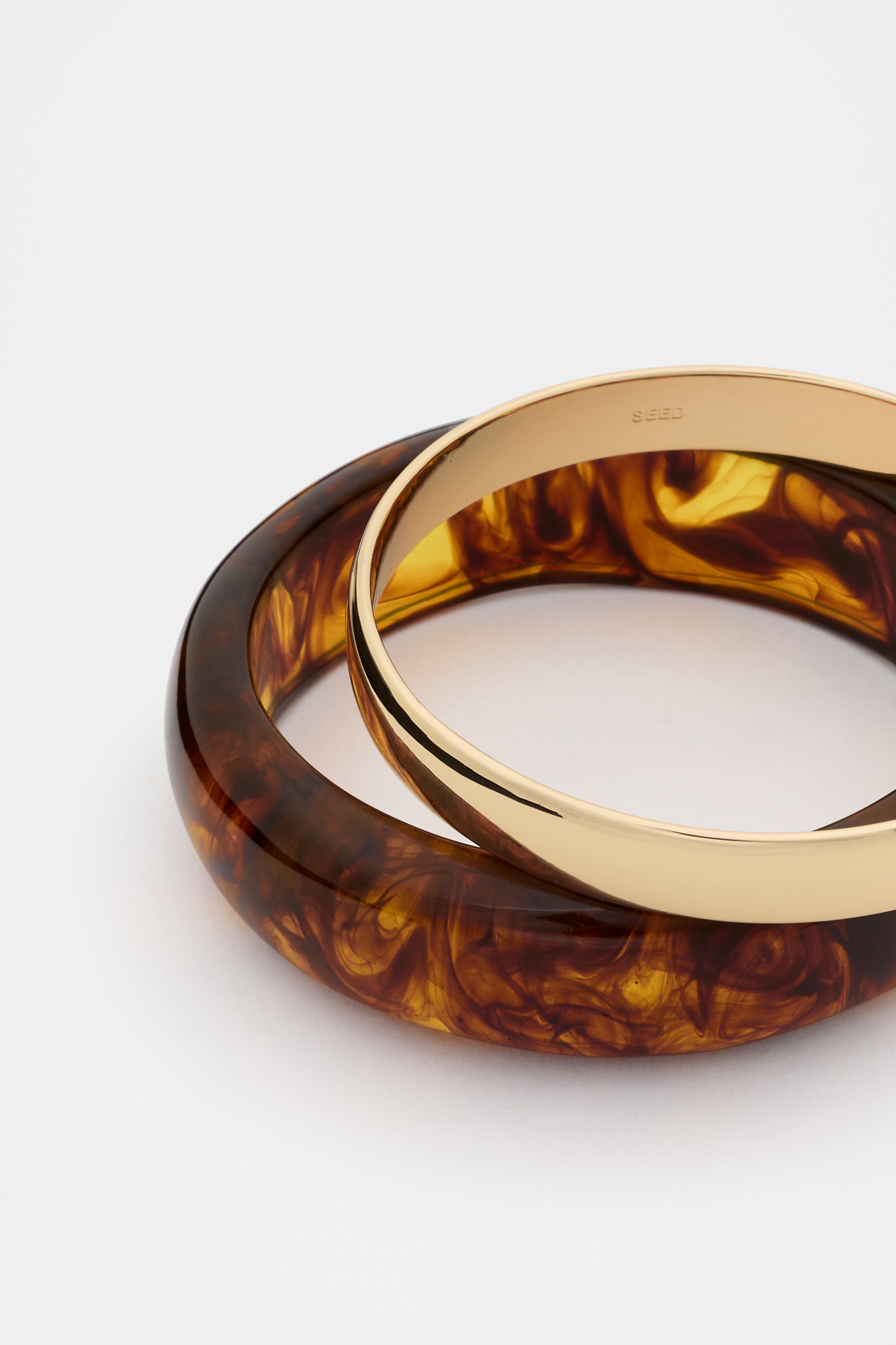 Elegantly designed, this set is ideal to add to your collection. It includes two bangles, one finished in a high shine gold tone and the other crafted in resin with a D profile. Pair with the matching resin earrings or ring for a chic curated set, or for the perfect gift.