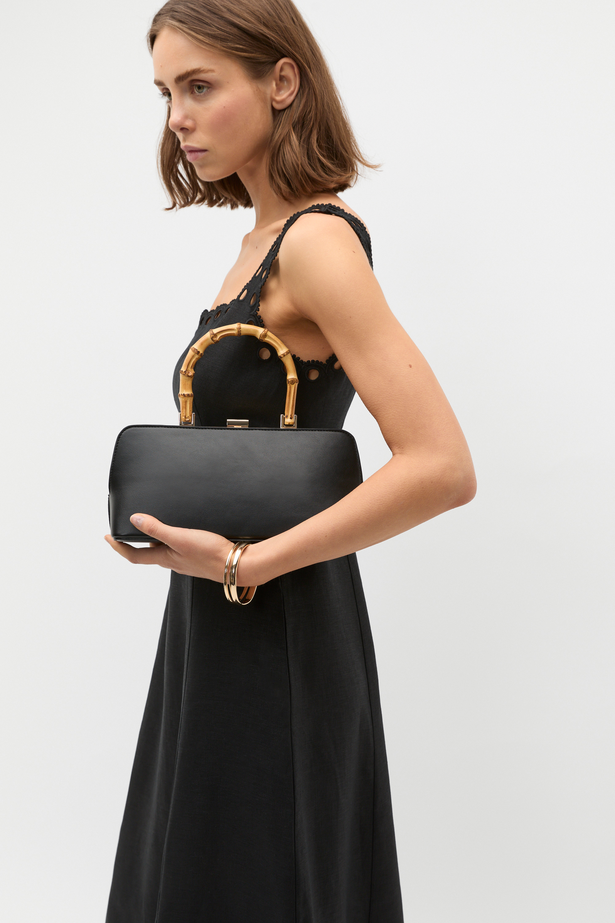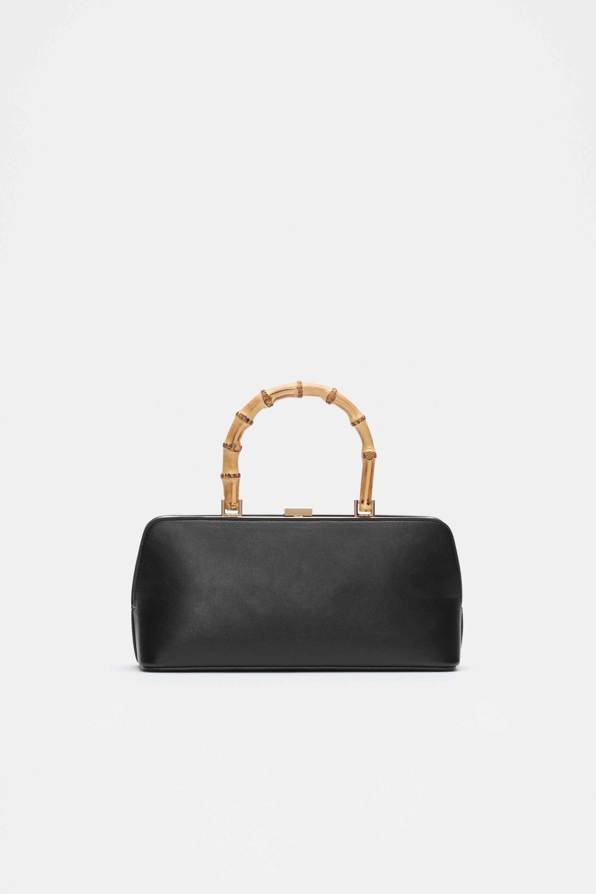 Simple and chic, this bag is detailed with a bamboo handle for added interest. It features a hardware closure, an internal zip pocket and is fully lined.