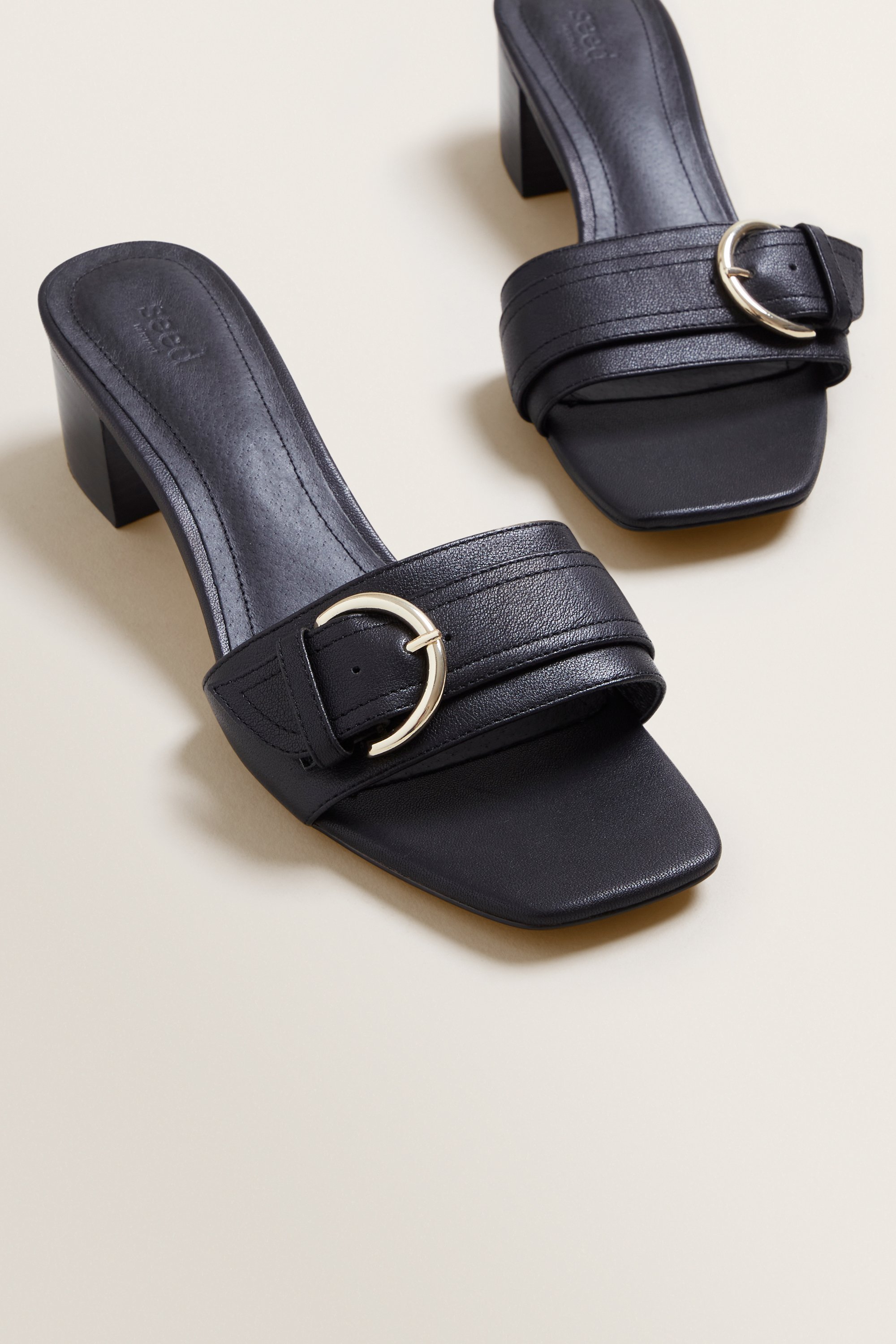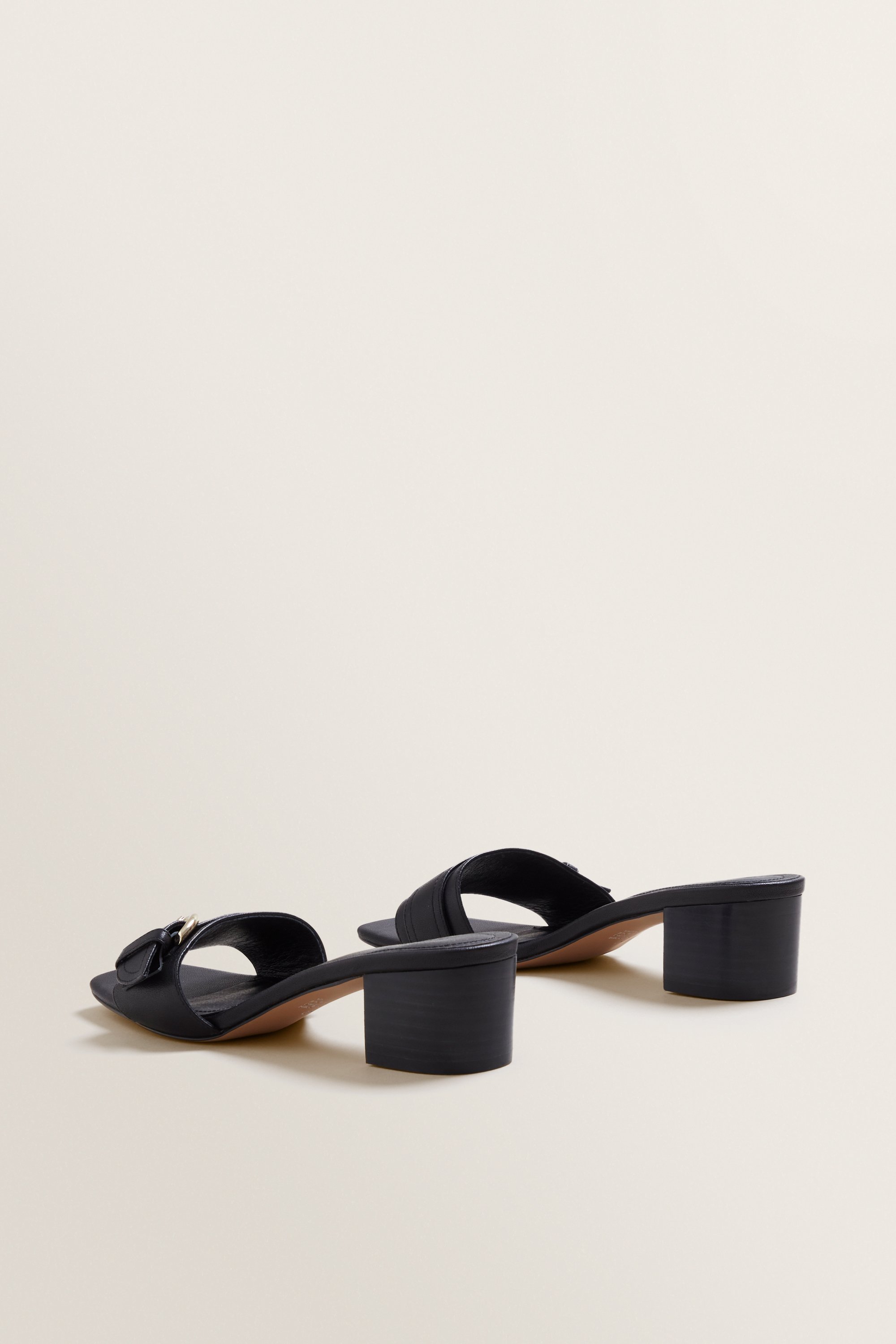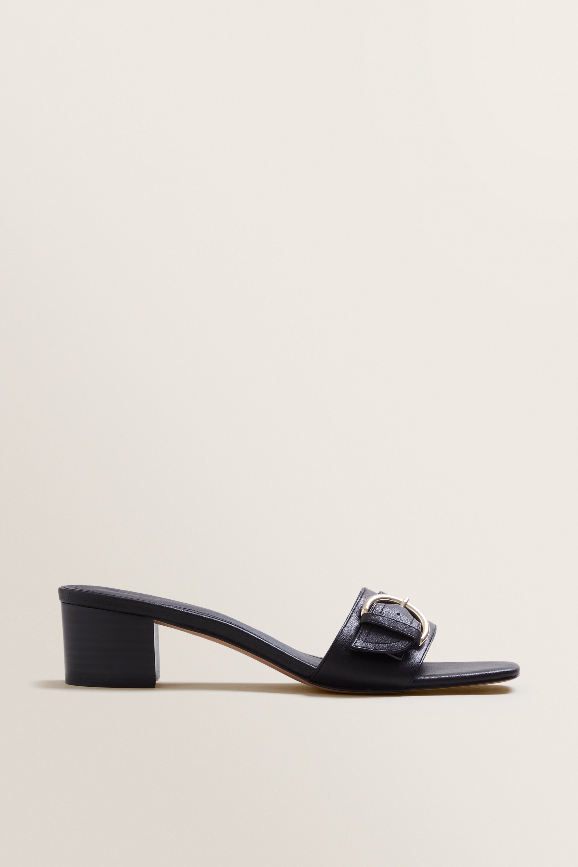 Designed with comfort in mind, the Harri Mule features gold buckle details, wood stack block heel and leather upper and lining.