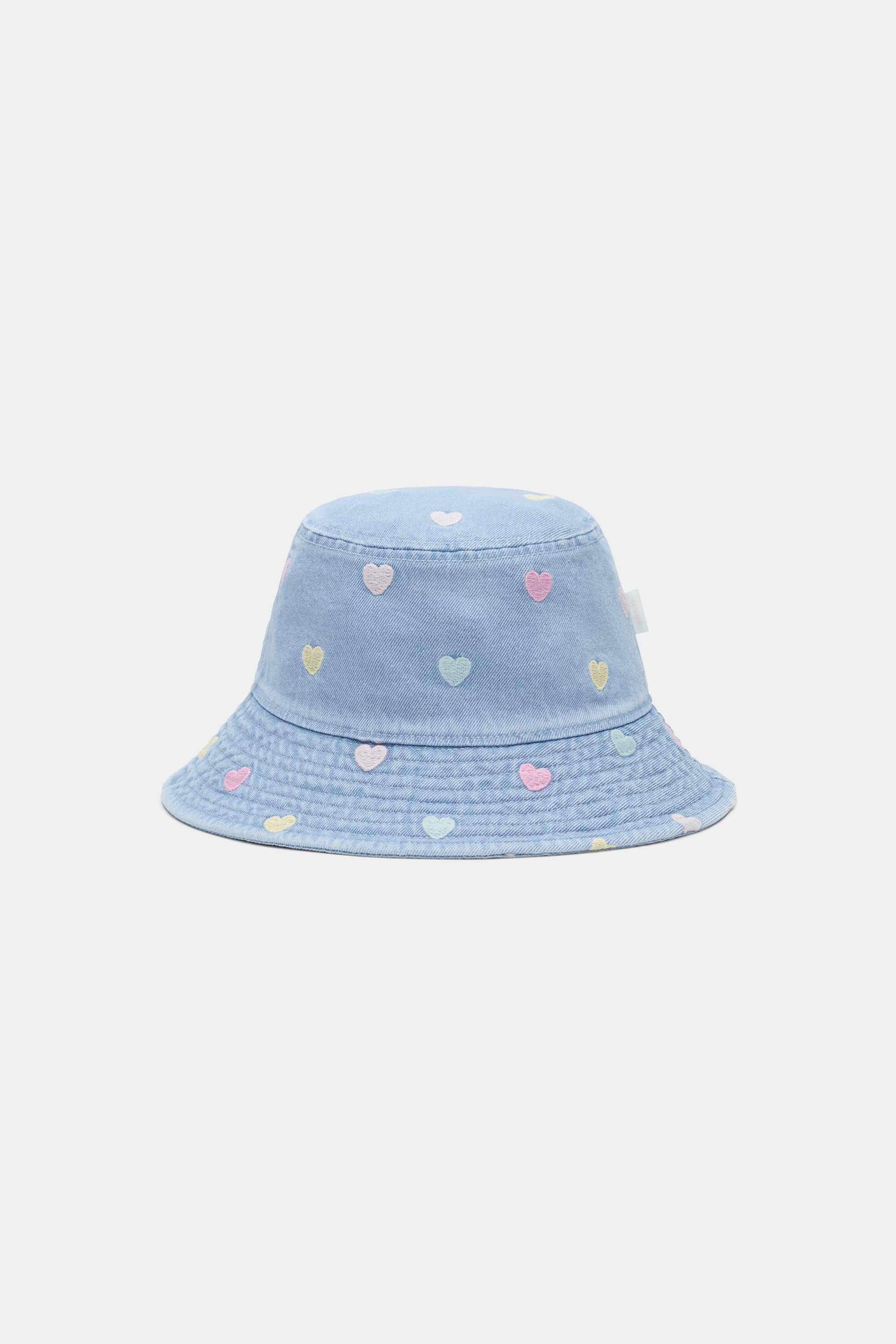 Designed to match our apparel styles, this adorable bucket hat is detailed with colourful embroidered hearts.