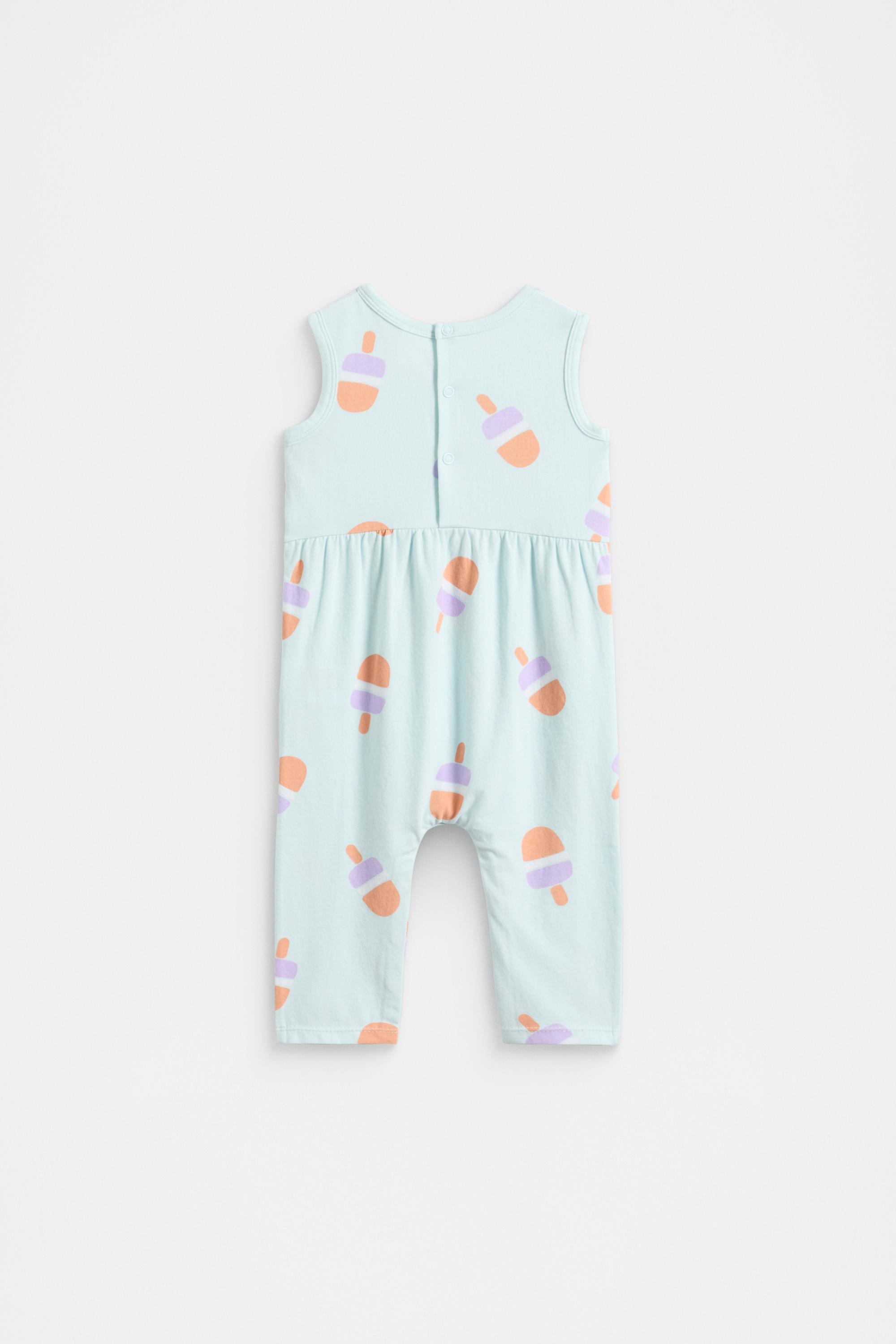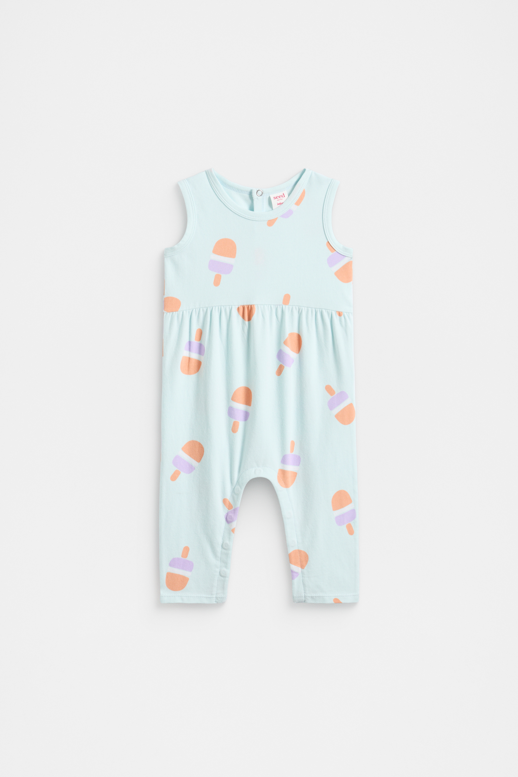 A sweet option for their little wardrobe, this jumpsuit is perfect for the warmer months. It features a round neck, sleeveless design, an all over ice block print and secures with buttons at the gusset and at the back of the neck.