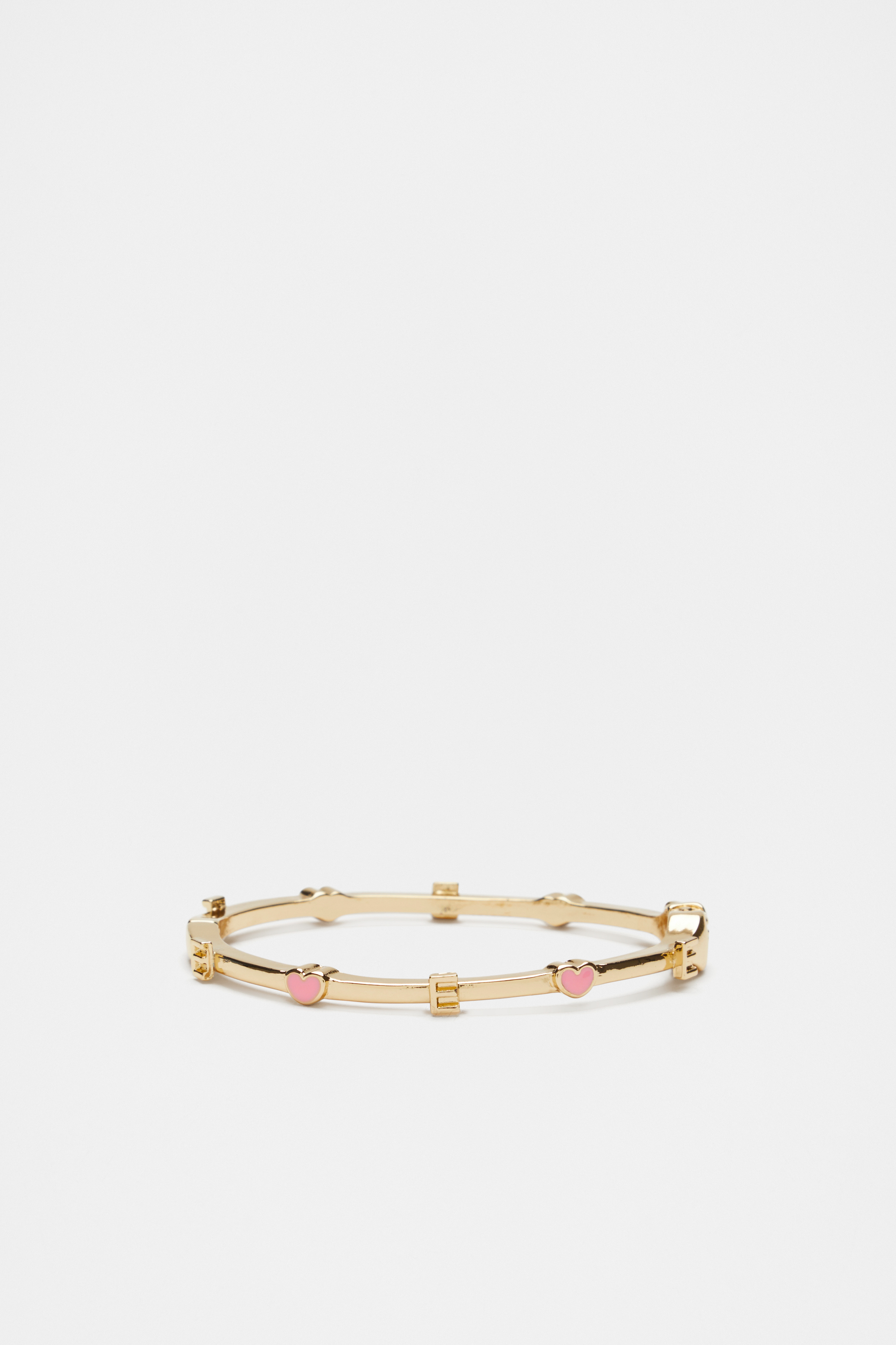 Add a bit of shine and personality to their look with this hinge bangle, featuring a gold-look finish and a pattern of hearts and an initial letter. This product is not a toy and is not suitable for children three years and under.