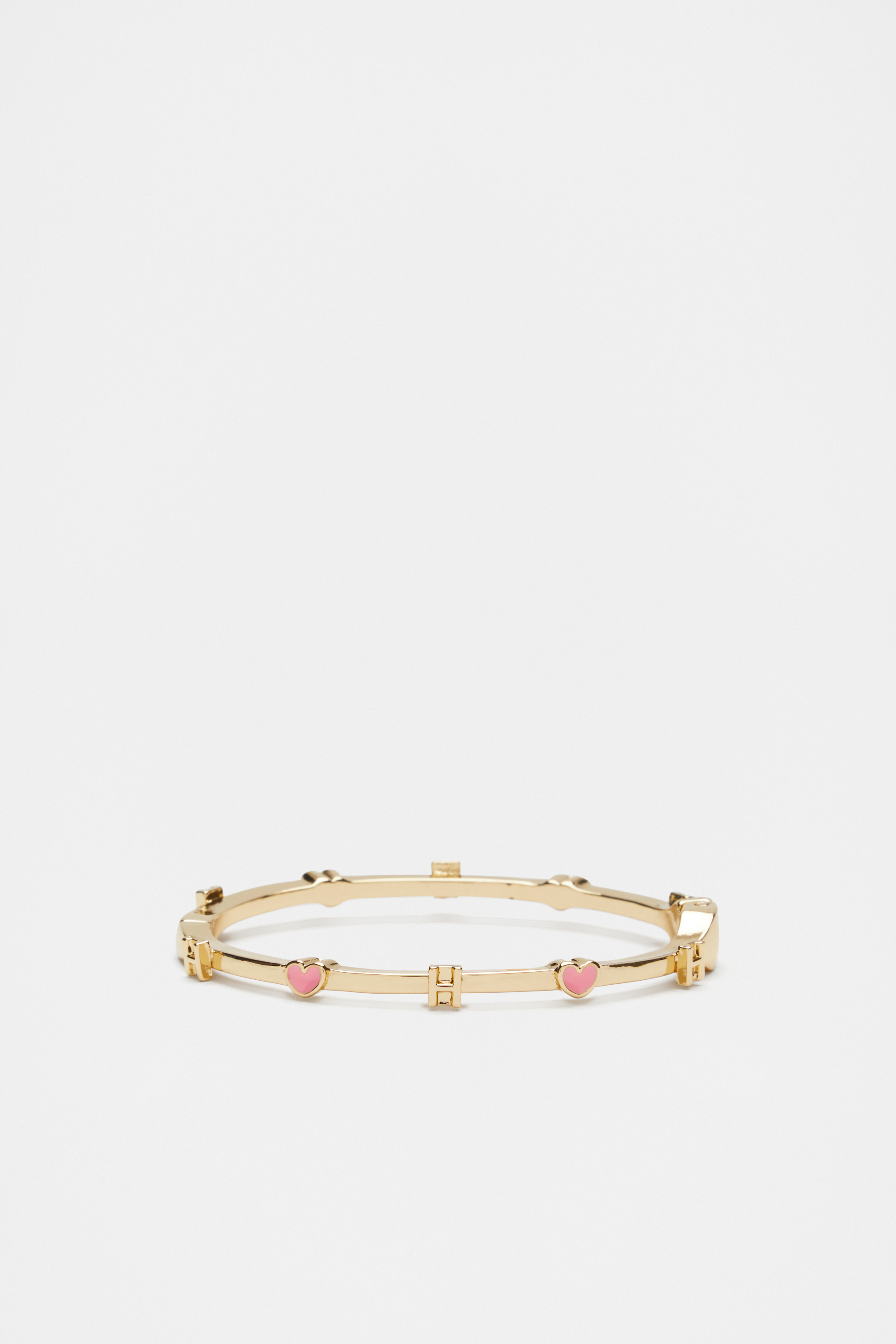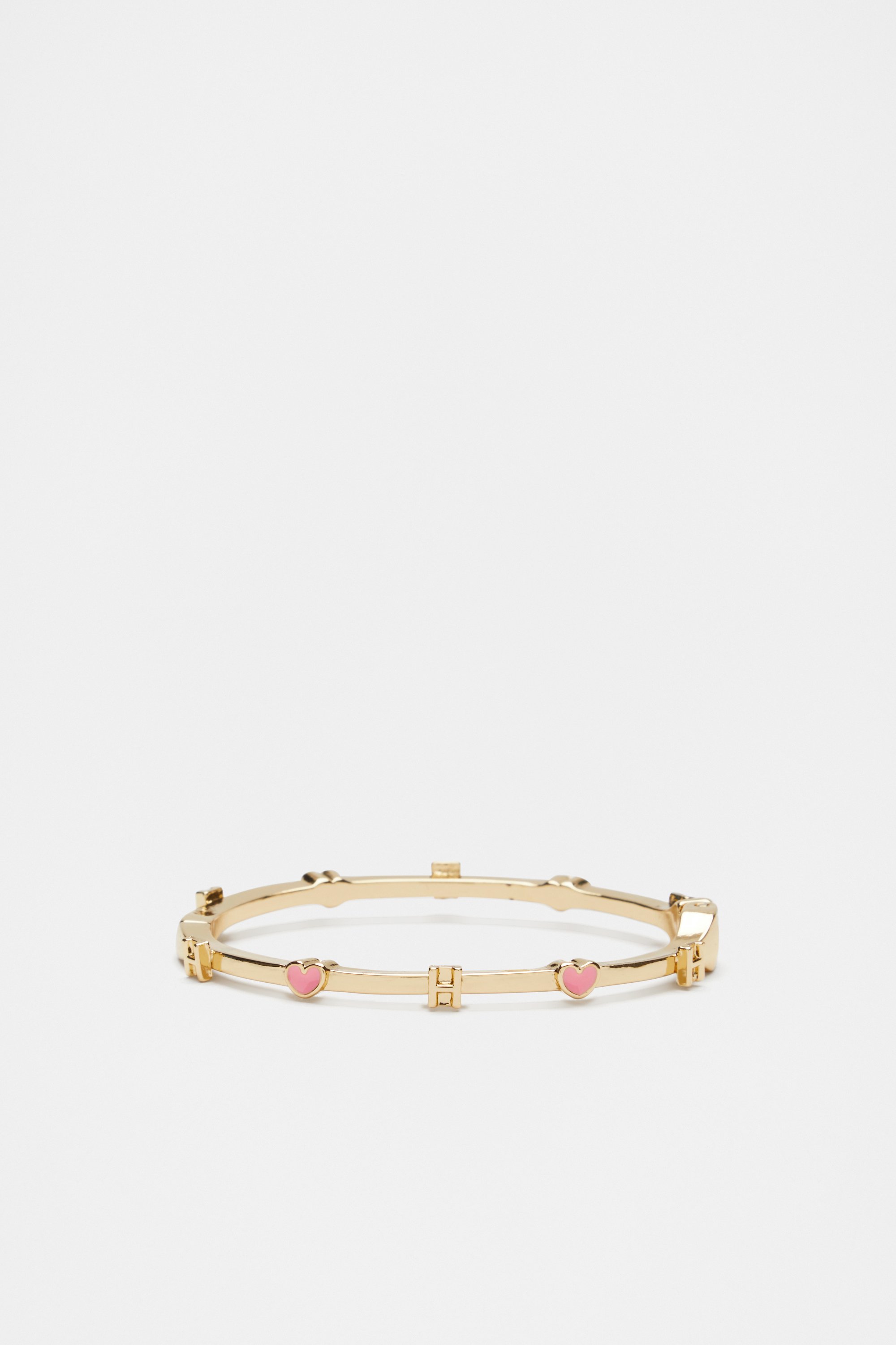 Add a bit of shine and personality to their look with this hinge bangle, featuring a gold-look finish and a pattern of hearts and an initial letter. This product is not a toy and is not suitable for children three years and under.