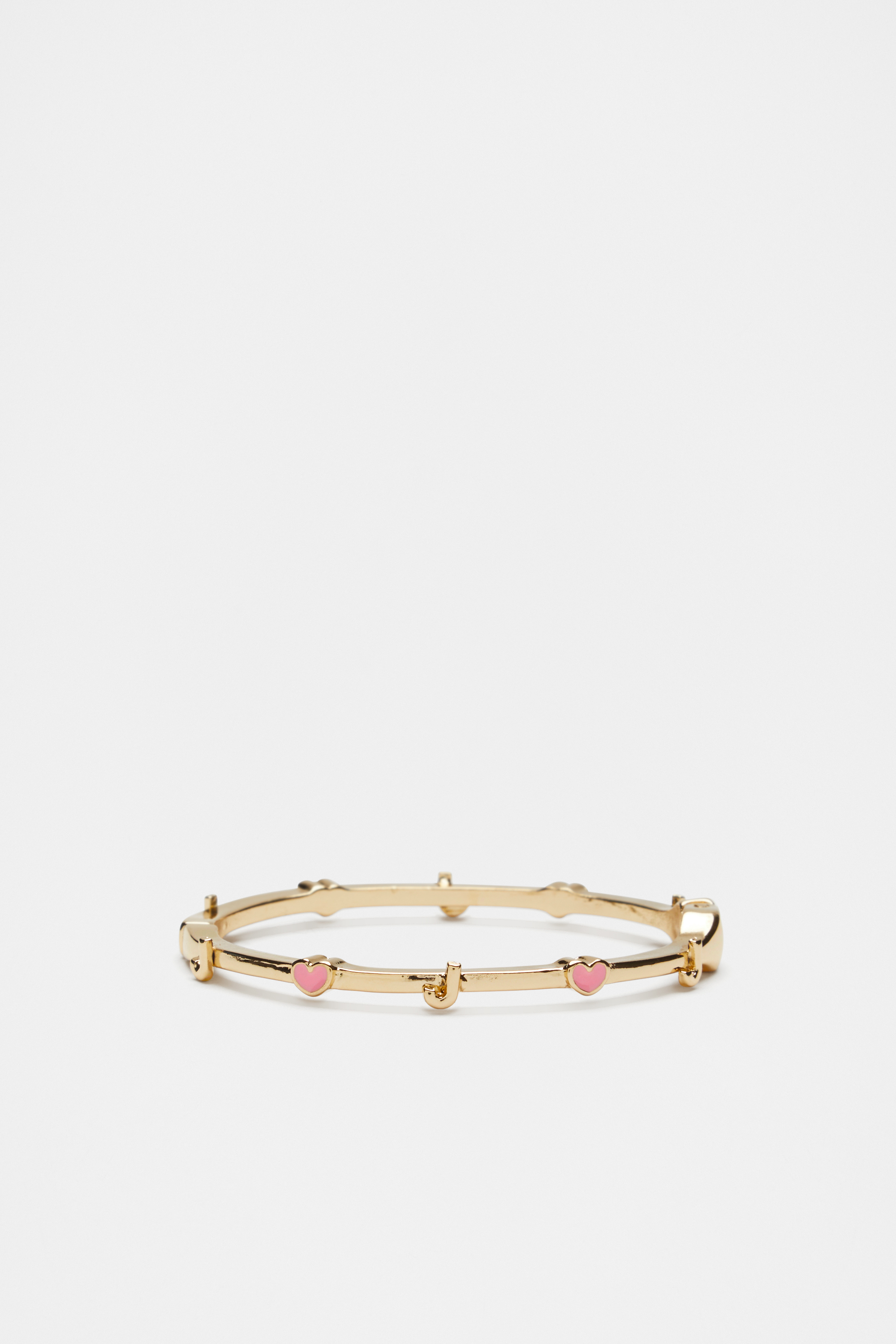Add a bit of shine and personality to their look with this hinge bangle, featuring a gold-look finish and a pattern of hearts and an initial letter. This product is not a toy and is not suitable for children three years and under.