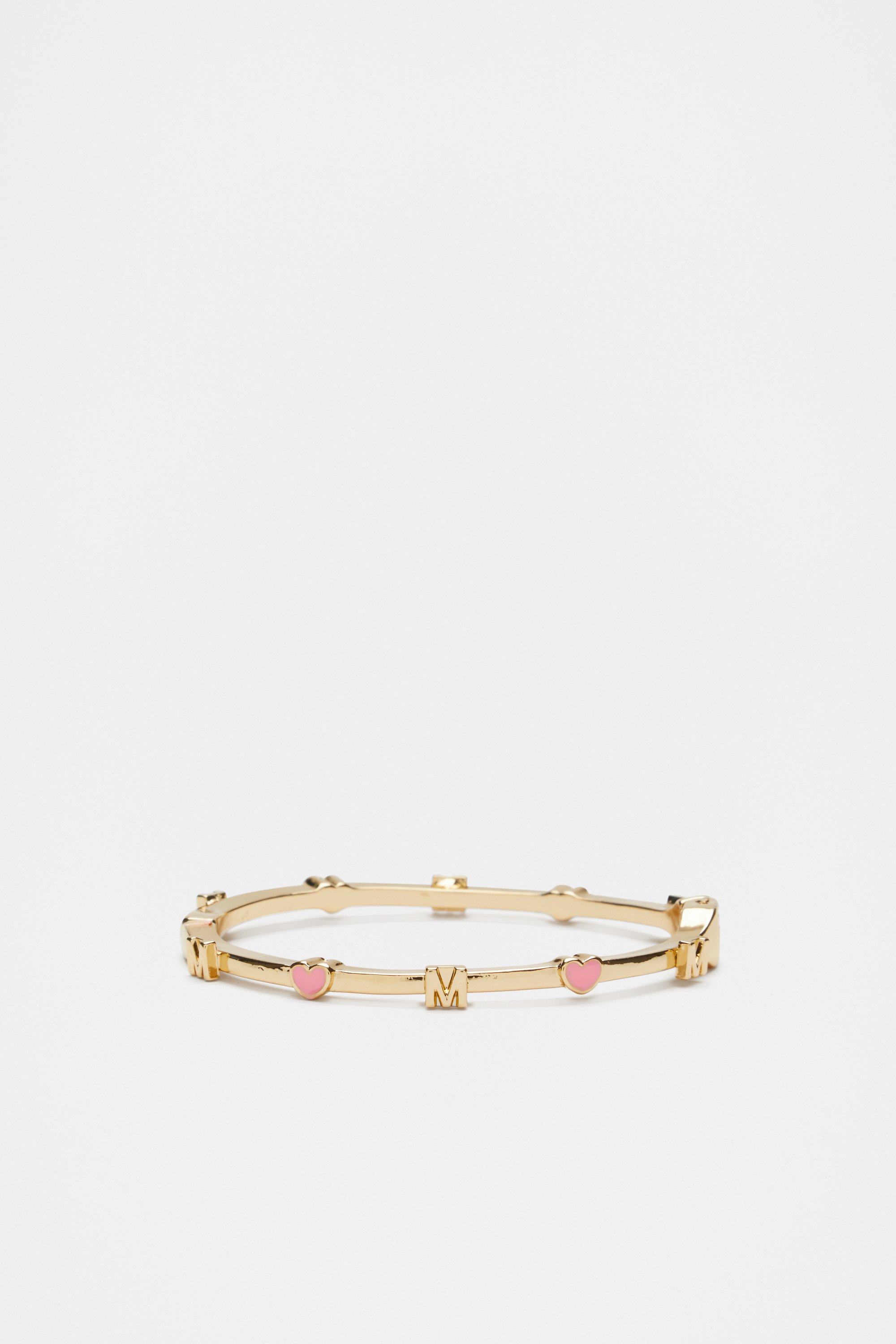 Add a bit of shine and personality to their look with this hinge bangle, featuring a gold-look finish and a pattern of hearts and an initial letter. This product is not a toy and is not suitable for children three years and under.