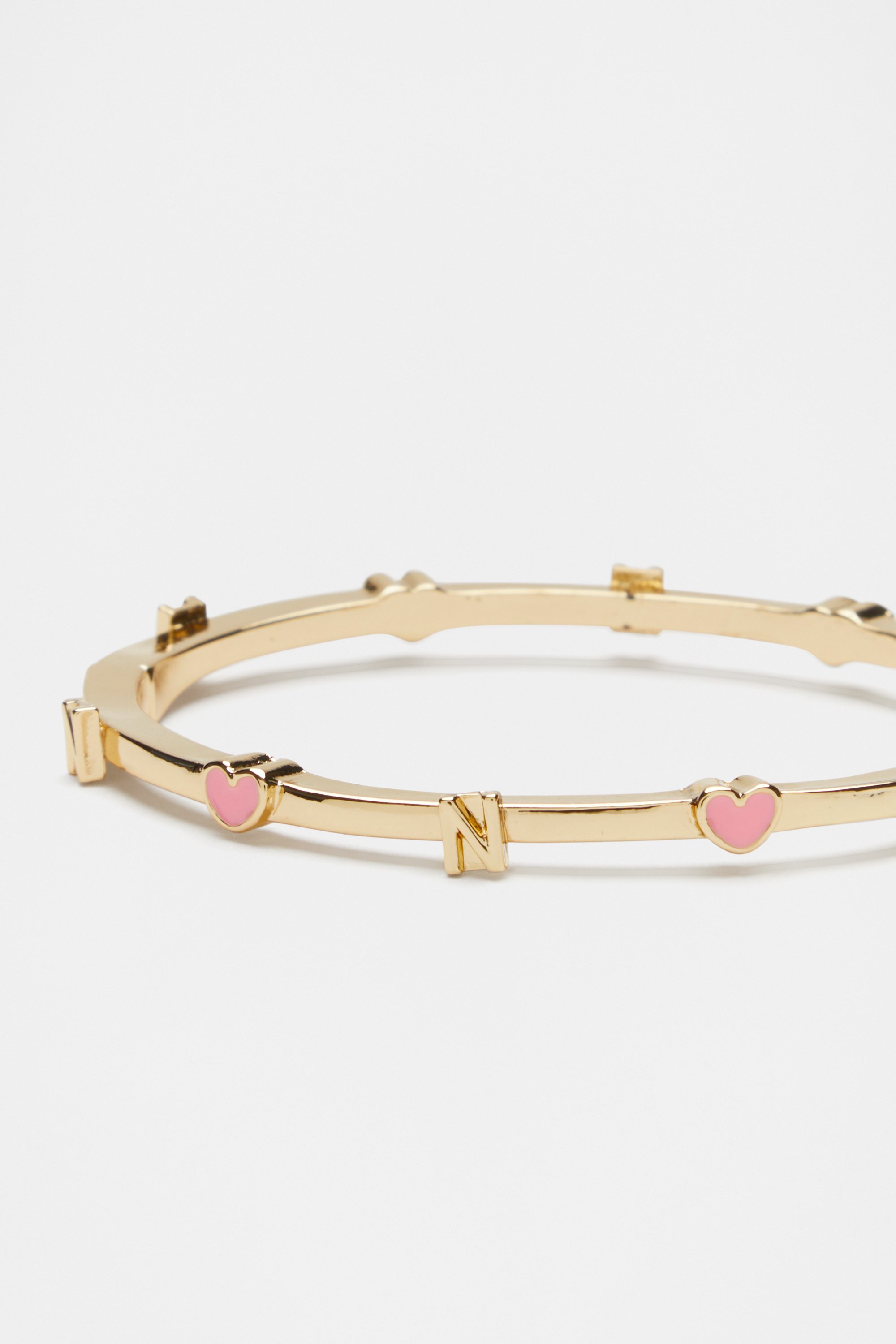 Add a bit of shine and personality to their look with this hinge bangle, featuring a gold-look finish and a pattern of hearts and an initial letter. This product is not a toy and is not suitable for children three years and under.