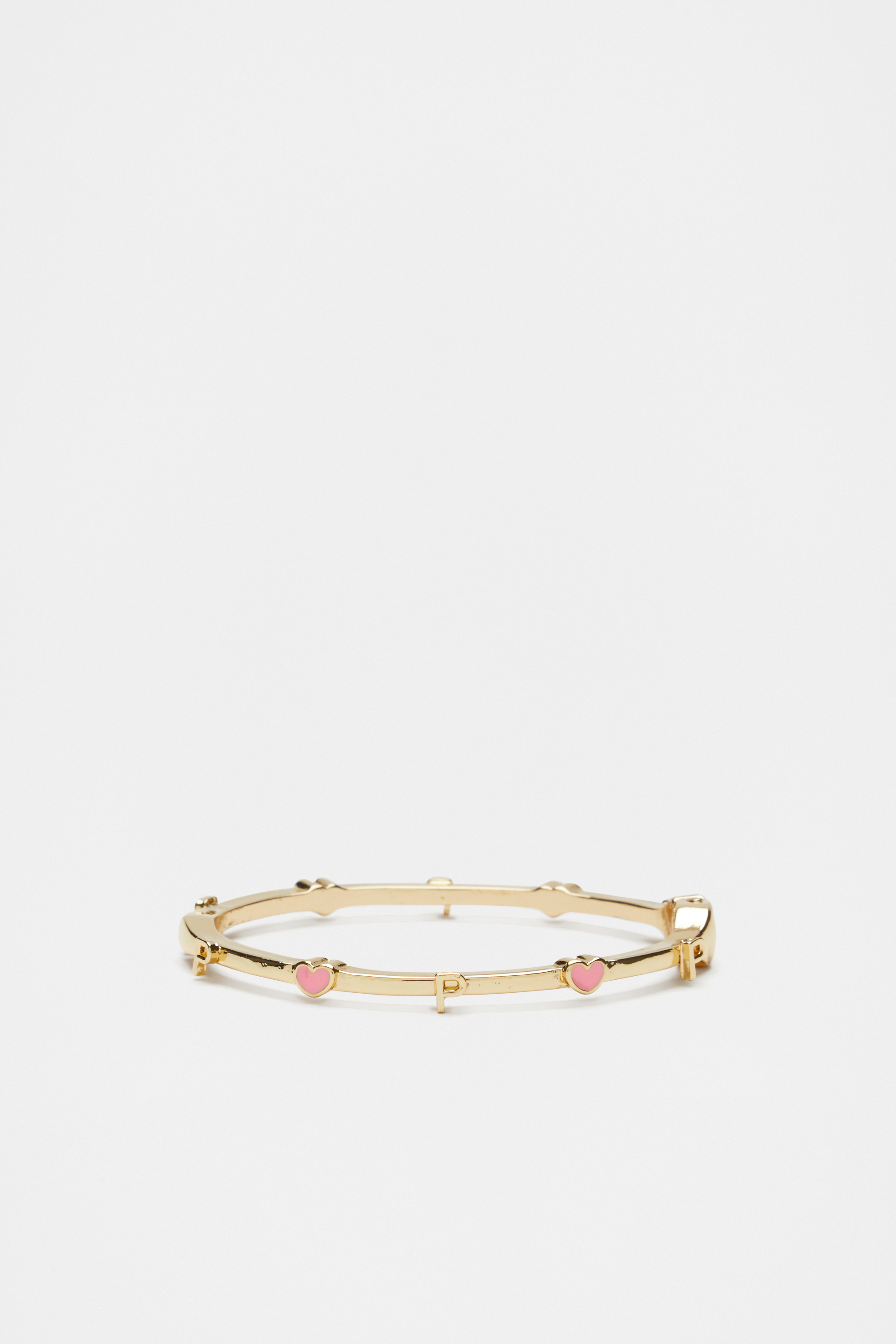 Add a bit of shine and personality to their look with this hinge bangle, featuring a gold-look finish and a pattern of hearts and an initial letter. This product is not a toy and is not suitable for children three years and under.