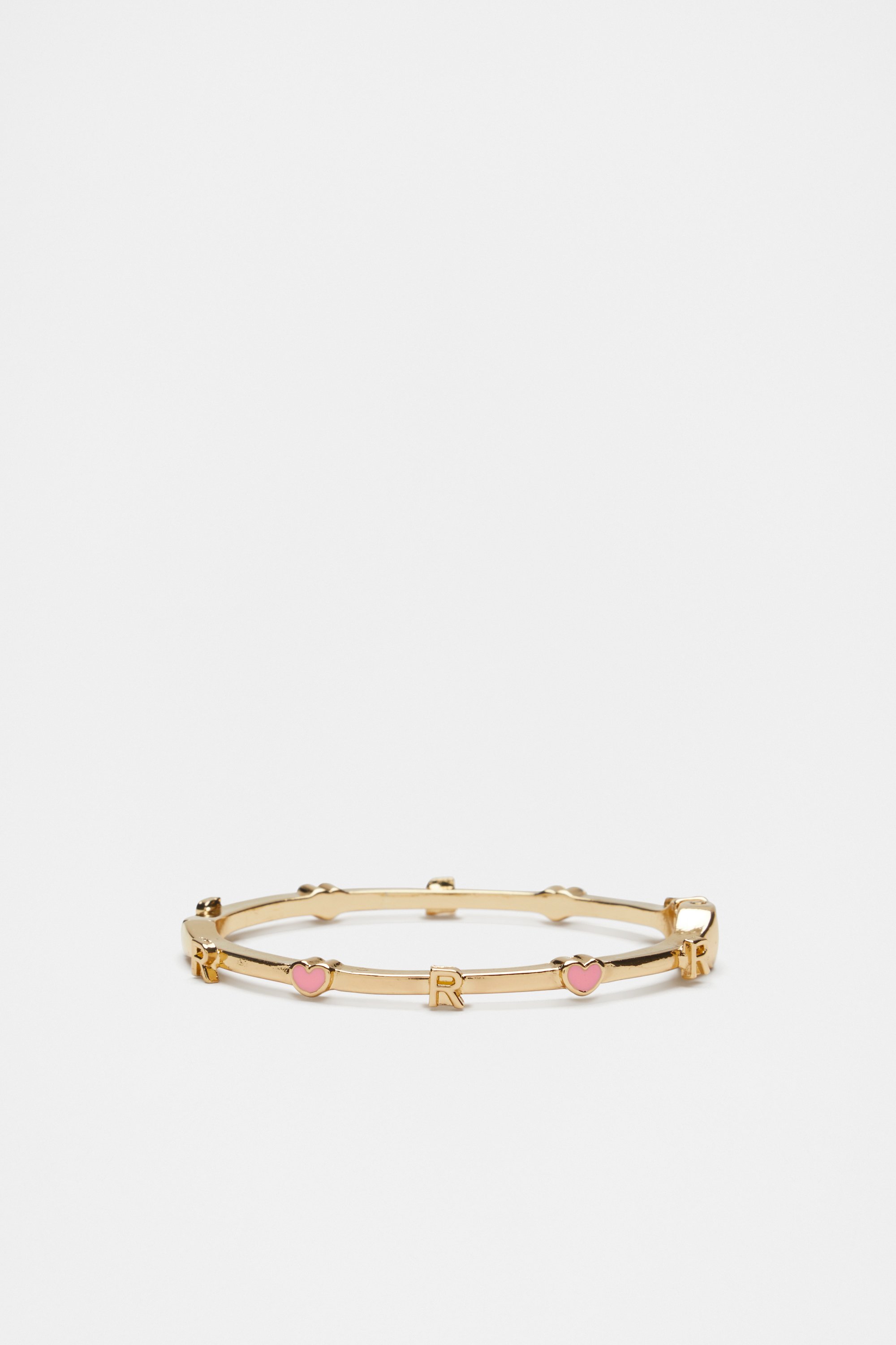 Add a bit of shine and personality to their look with this hinge bangle, featuring a gold-look finish and a pattern of hearts and an initial letter. This product is not a toy and is not suitable for children three years and under.