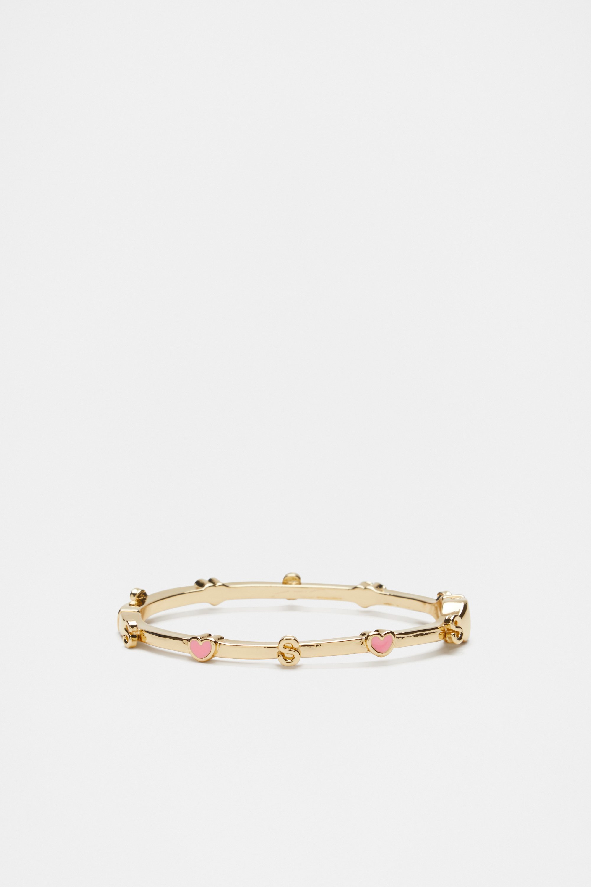 Add a bit of shine and personality to their look with this hinge bangle, featuring a gold-look finish and a pattern of hearts and an initial letter. This product is not a toy and is not suitable for children three years and under.