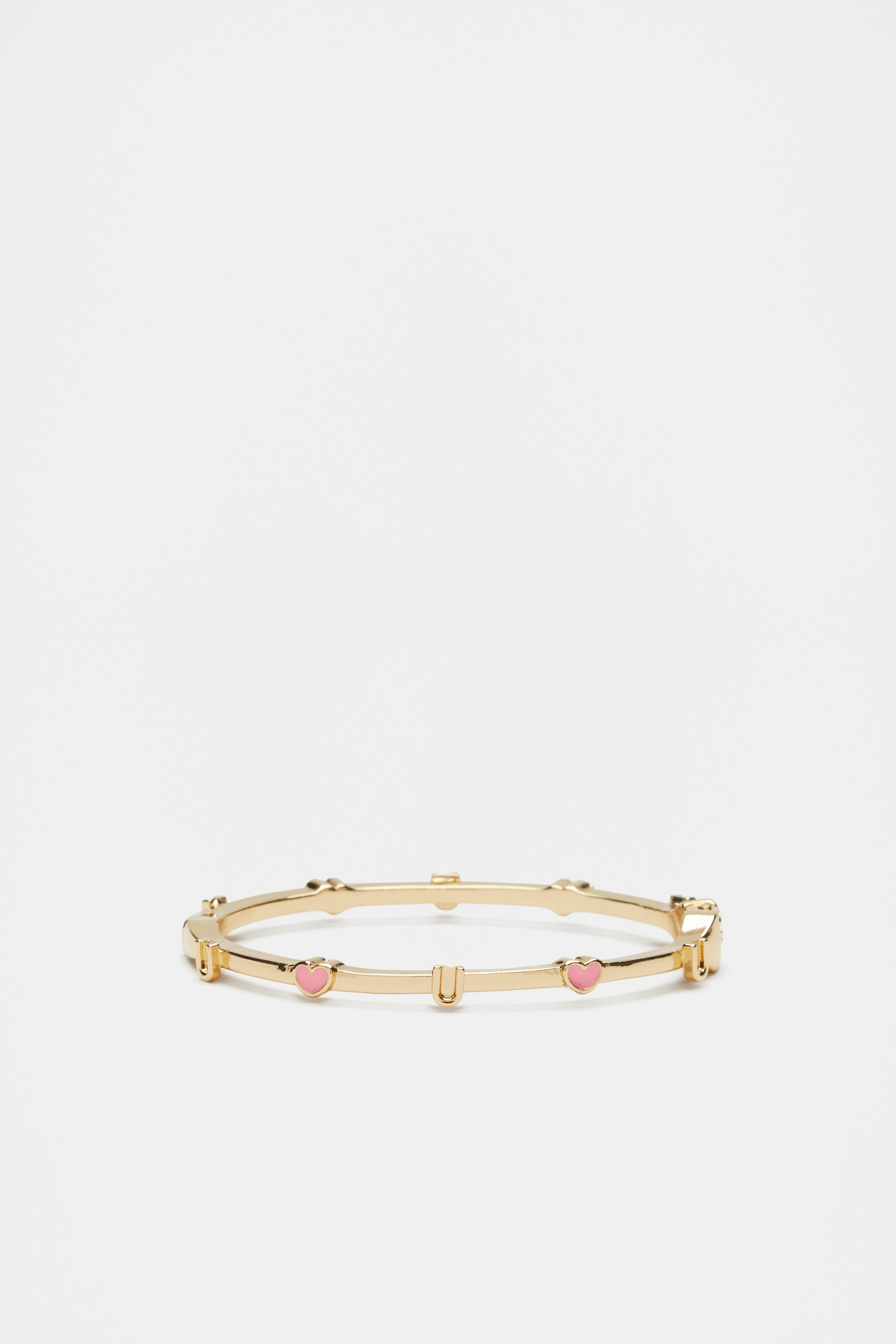 Add a bit of shine and personality to their look with this hinge bangle, featuring a gold-look finish and a pattern of hearts and an initial letter. This product is not a toy and is not suitable for children three years and under.