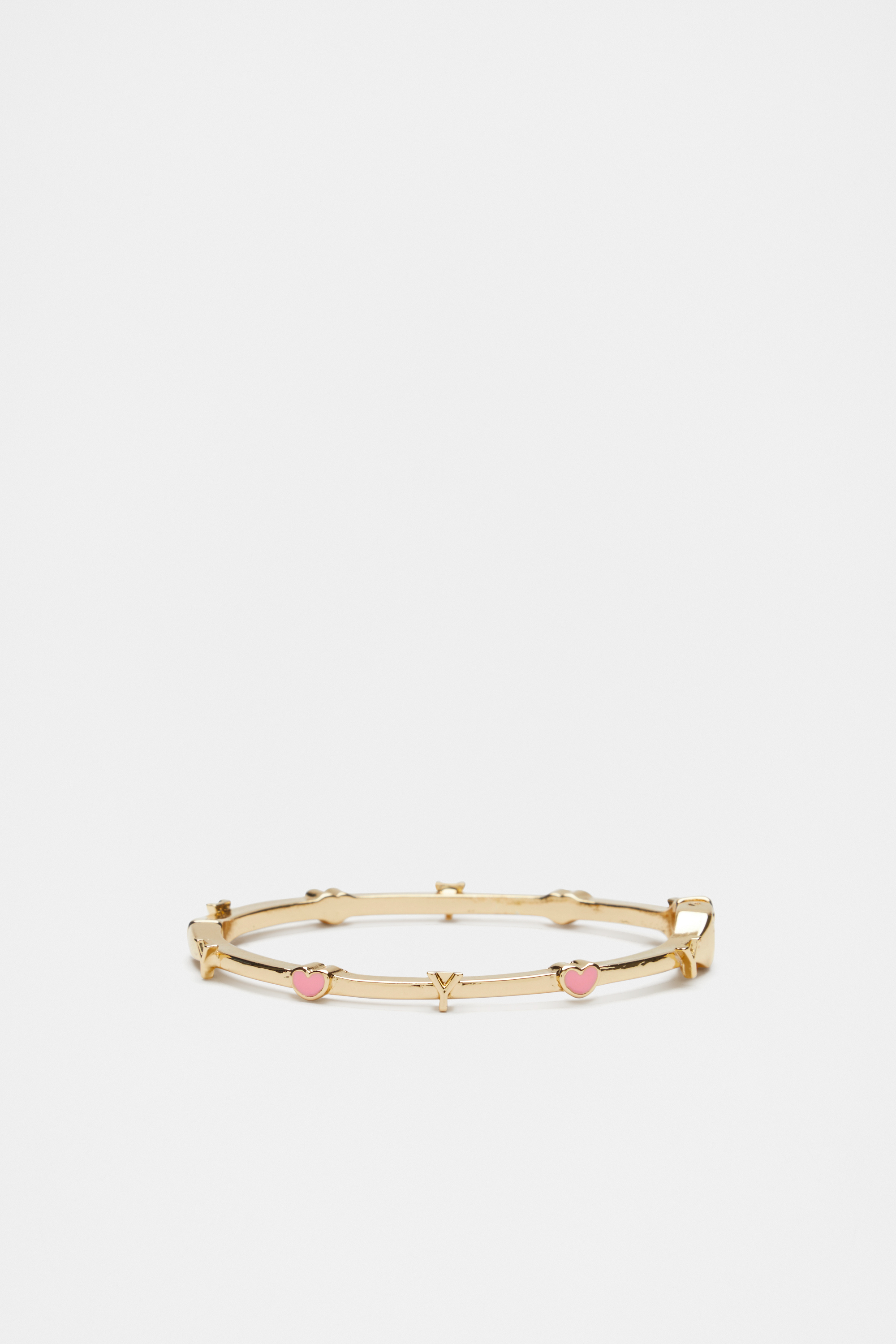 Add a bit of shine and personality to their look with this hinge bangle, featuring a gold-look finish and a pattern of hearts and an initial letter. This product is not a toy and is not suitable for children three years and under.