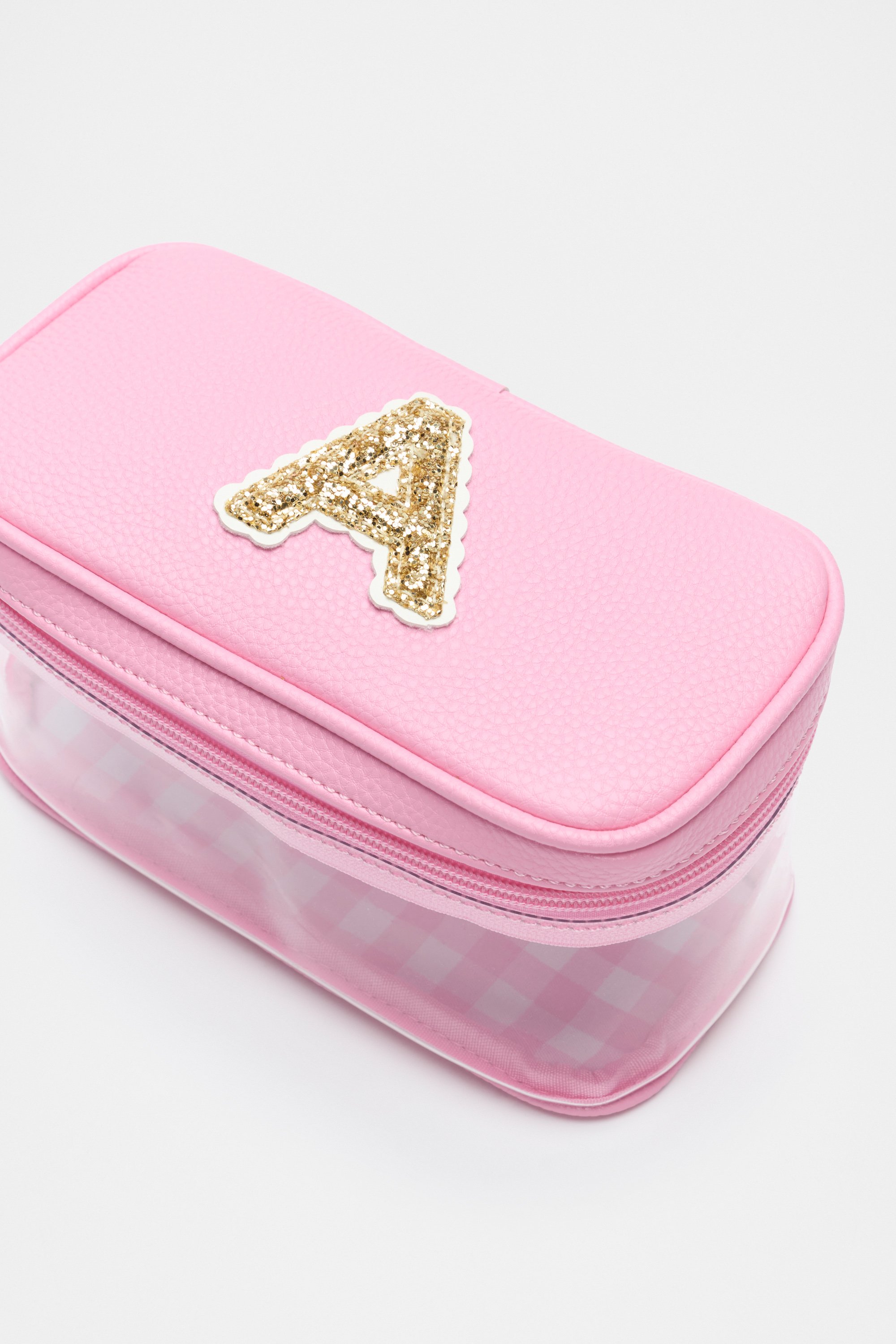 Ideal to keep her things together, this cosmetics bag is detailed with a glitter initial making it the perfect personalised gift. It features a clear design with a zipped lid closure, soft gold hardware and an internal gingham design. It also has a branded carry handle