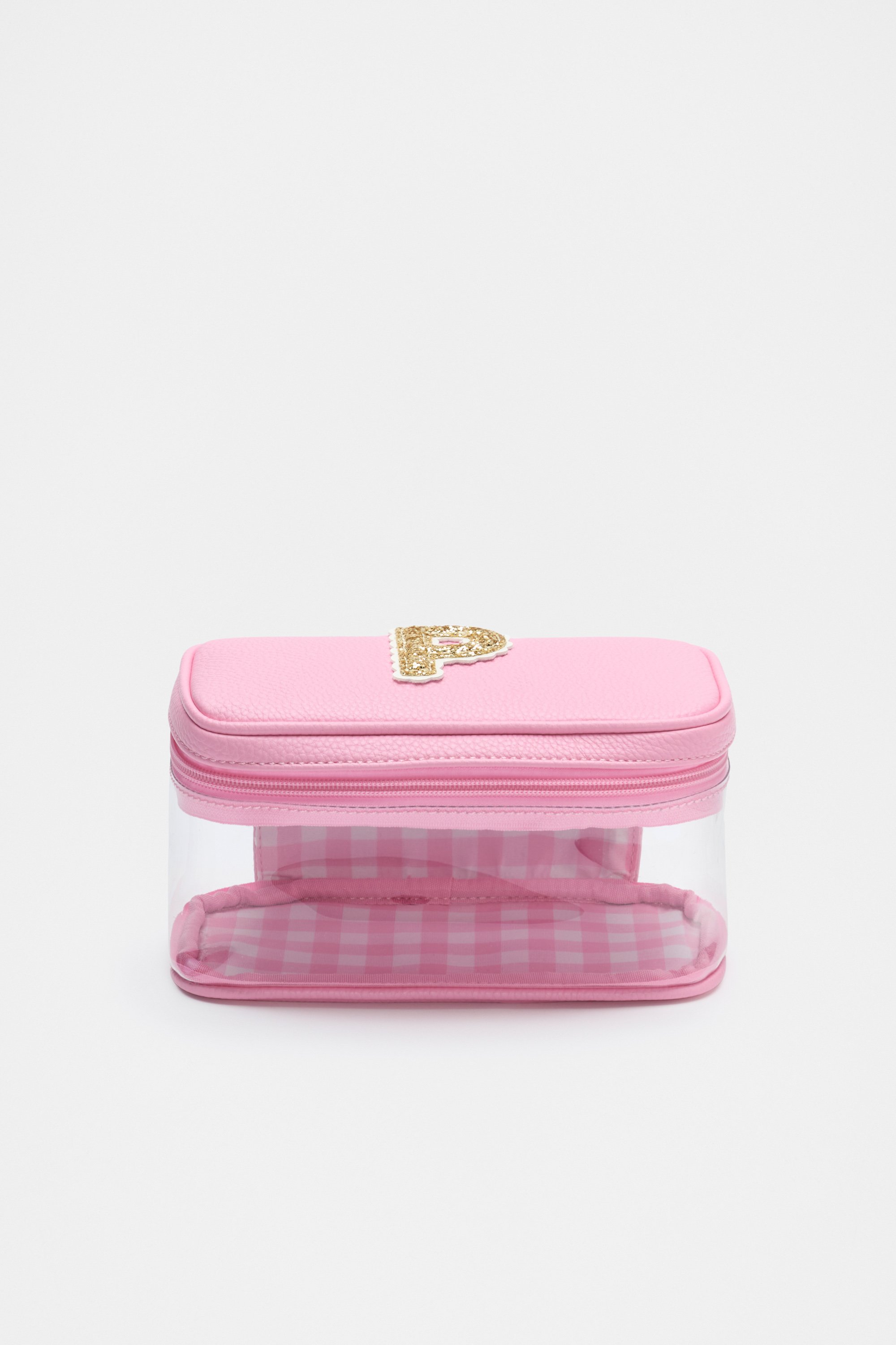 Ideal to keep her things together, this cosmetics bag is detailed with a glitter initial making it the perfect personalised gift. It features a clear design with a zipped lid closure, soft gold hardware and an internal gingham design. It also has a branded carry handle