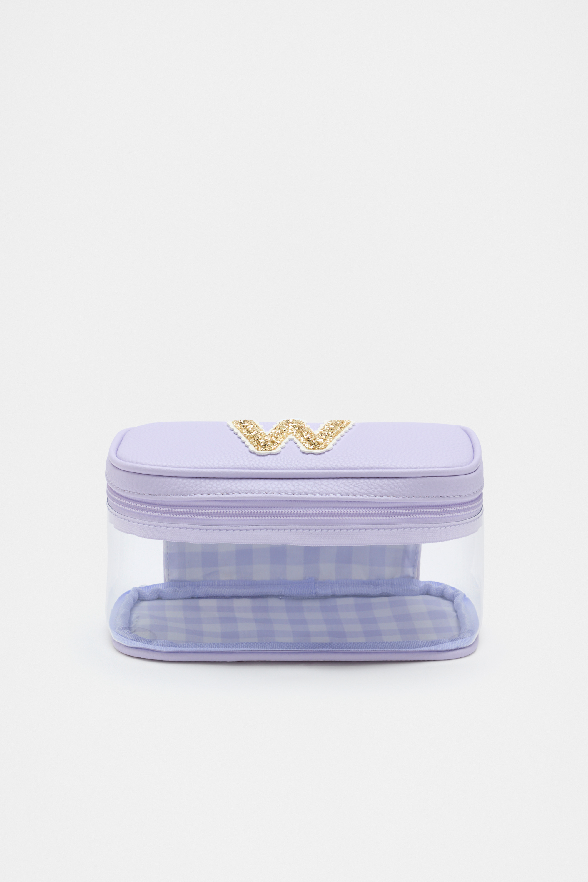 Ideal to keep her things together, this cosmetics bag is detailed with a glitter initial making it the perfect personalised gift. It features a clear design with a zipped lid closure, soft gold hardware and an internal gingham design. It also has a branded carry handle