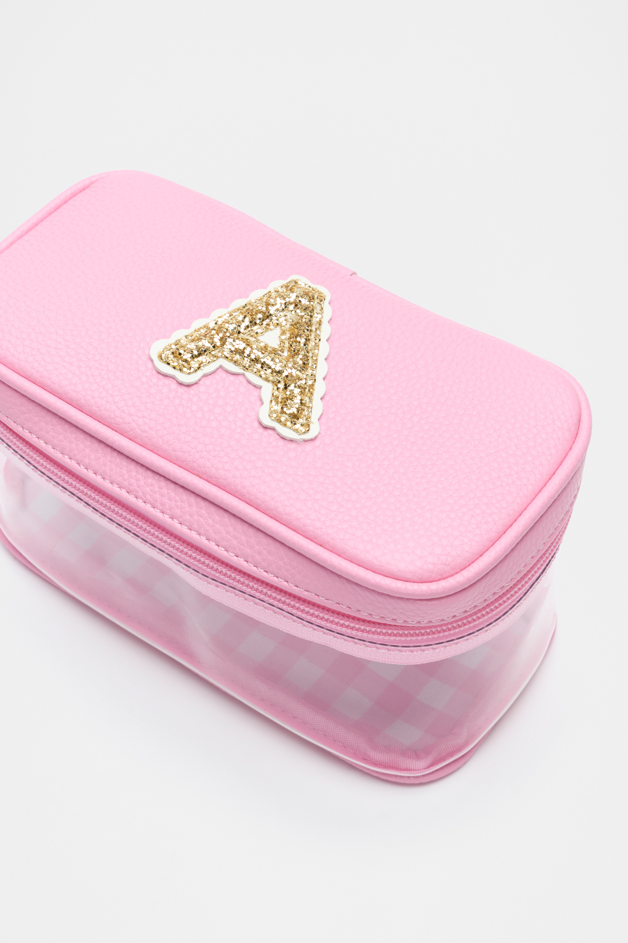 Ideal to keep her things together, this cosmetics bag is detailed with a glitter initial making it the perfect personalised gift. It features a clear design with a zipped lid closure, soft gold hardware and an internal gingham design. It also has a branded carry handle