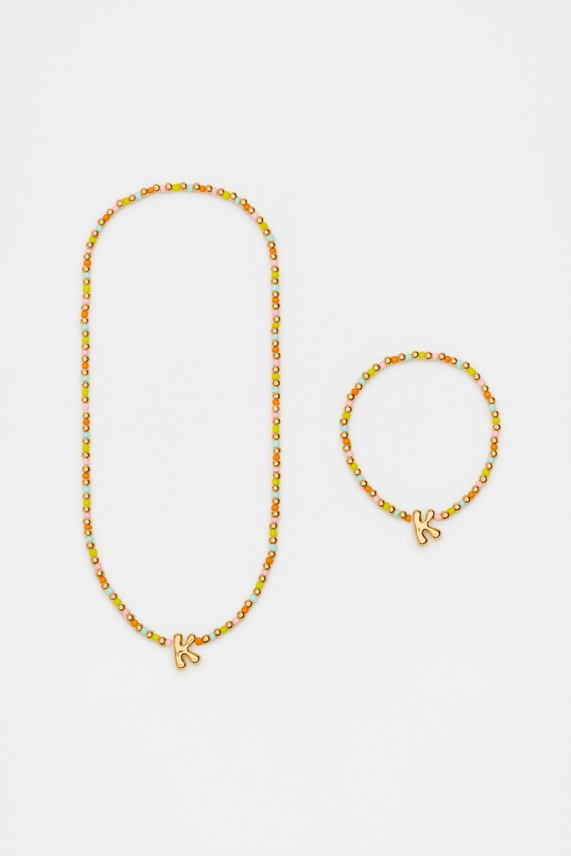 Personalised and sweet, this jewellery set is one she'll adore. It features a matching necklace and bracelet with a beaded design and initial detail. On a stretchy elastic, it's easy to take on and off. This product is not a toy and is not suitable for children three years and under.