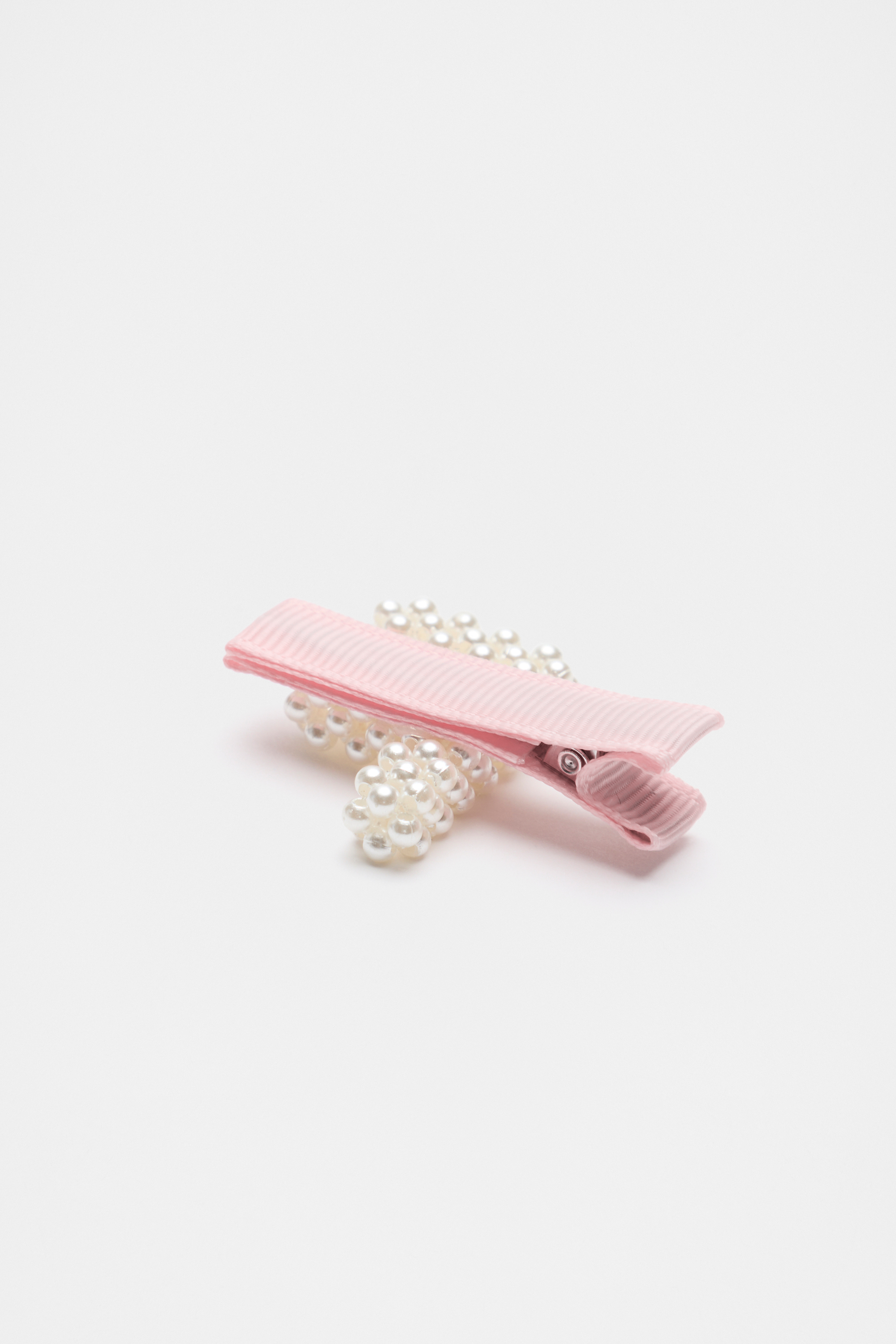 This hair snap is the ideal style to add a personal touch. It features an initial design of pearls on a grosgrain ribbon duck clip. This product is not a toy and is not suitable for children three years and under.