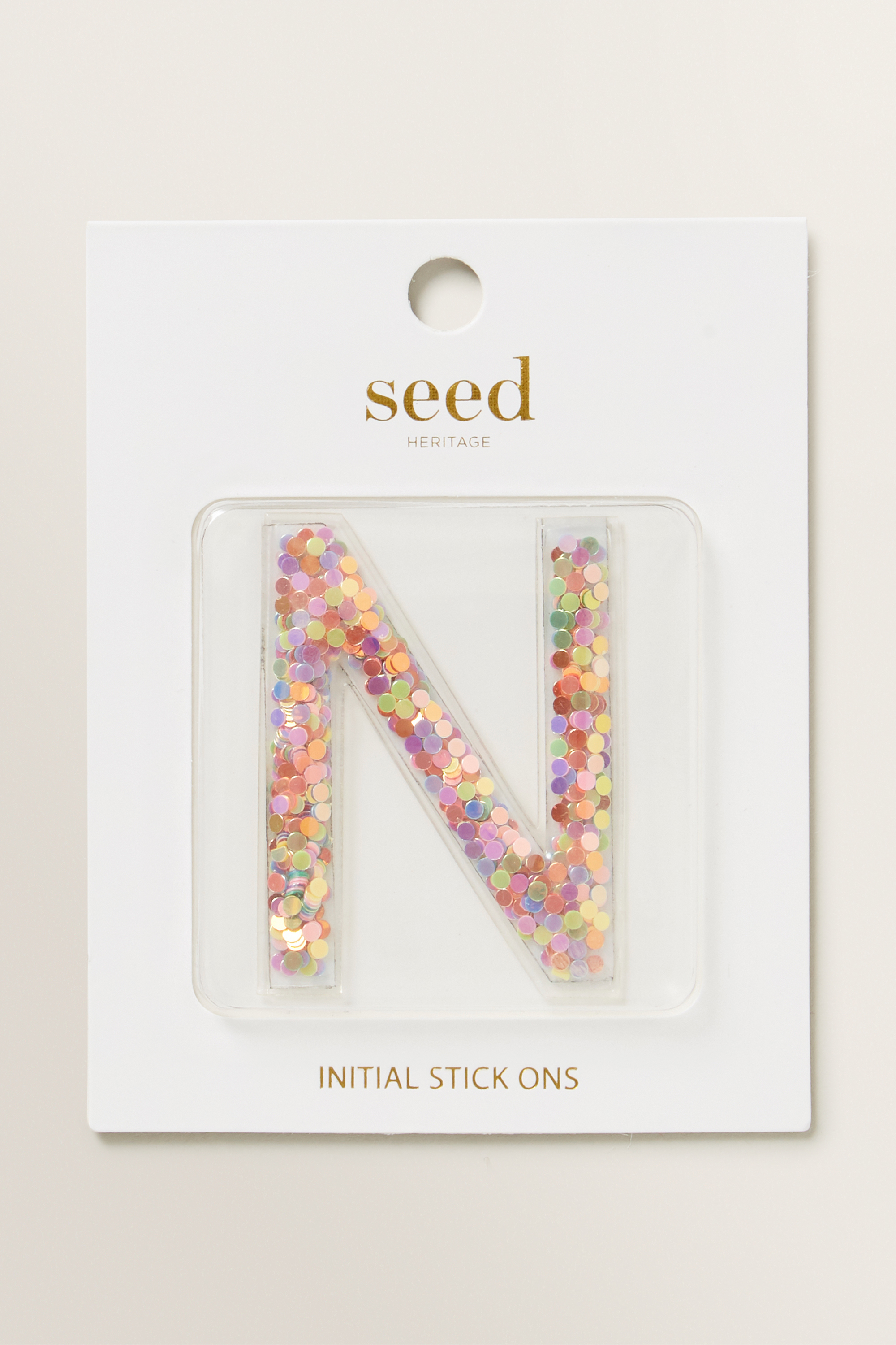 Personalise Seed accessories, with these Initial Stick On's. Peel back the protective layer, and stick these glittery letters to smart devices, backpacks, notebooks and doors. This is not a toy. Potential choking hazard. Not recommended for children 3 years and under.