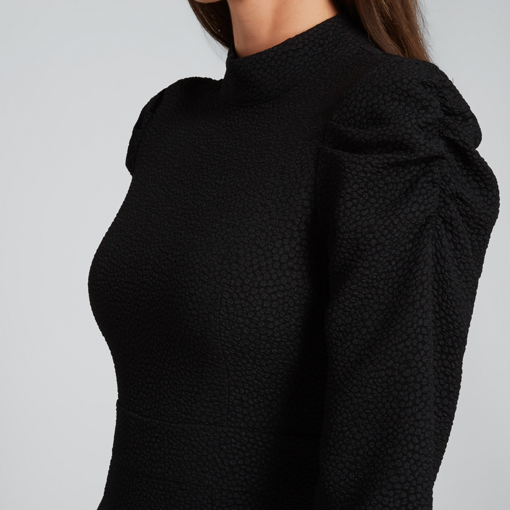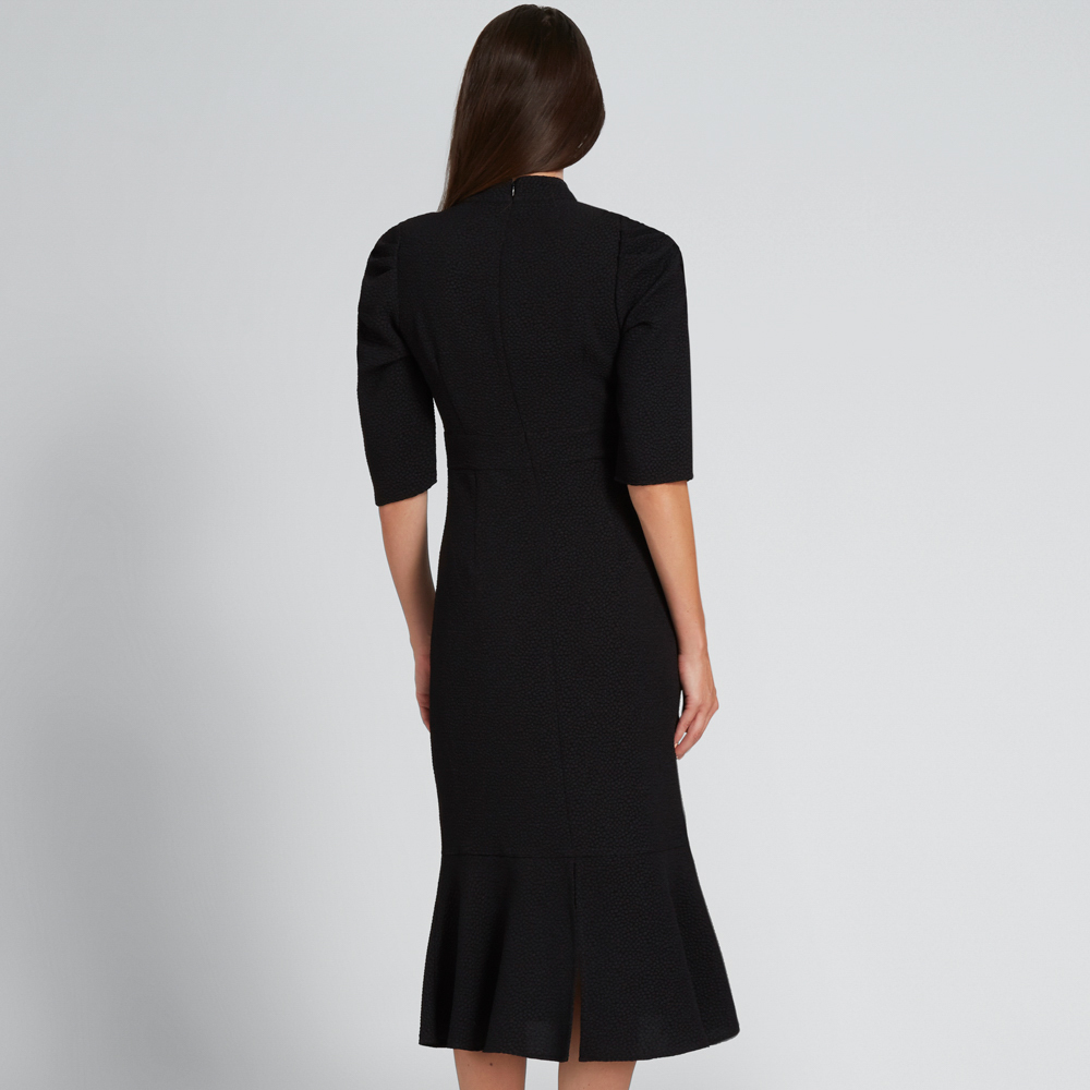 Cut from a luxe jacquard fabric for added texture, this ultra-flattering dress features a slimming waist, frill hem, high-neck and gathered 3/4 sleeve. This dress is available in Black and in sizes 6 to 14. Our model wears a size 8 and is 179cm tall. This dress been styled with the Gemma Heel and Mini Hoop. Please wash as per care instructions found on garment.