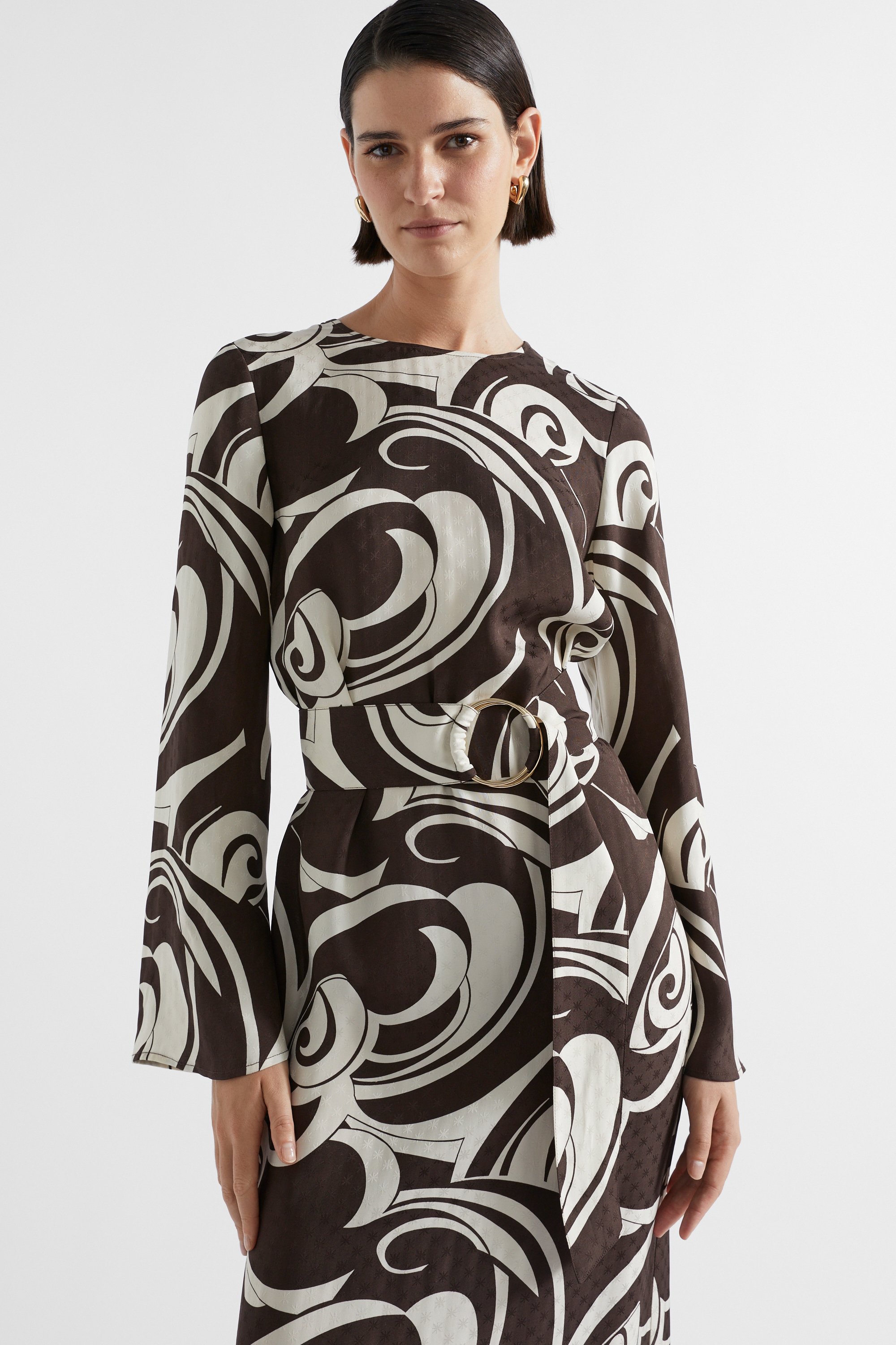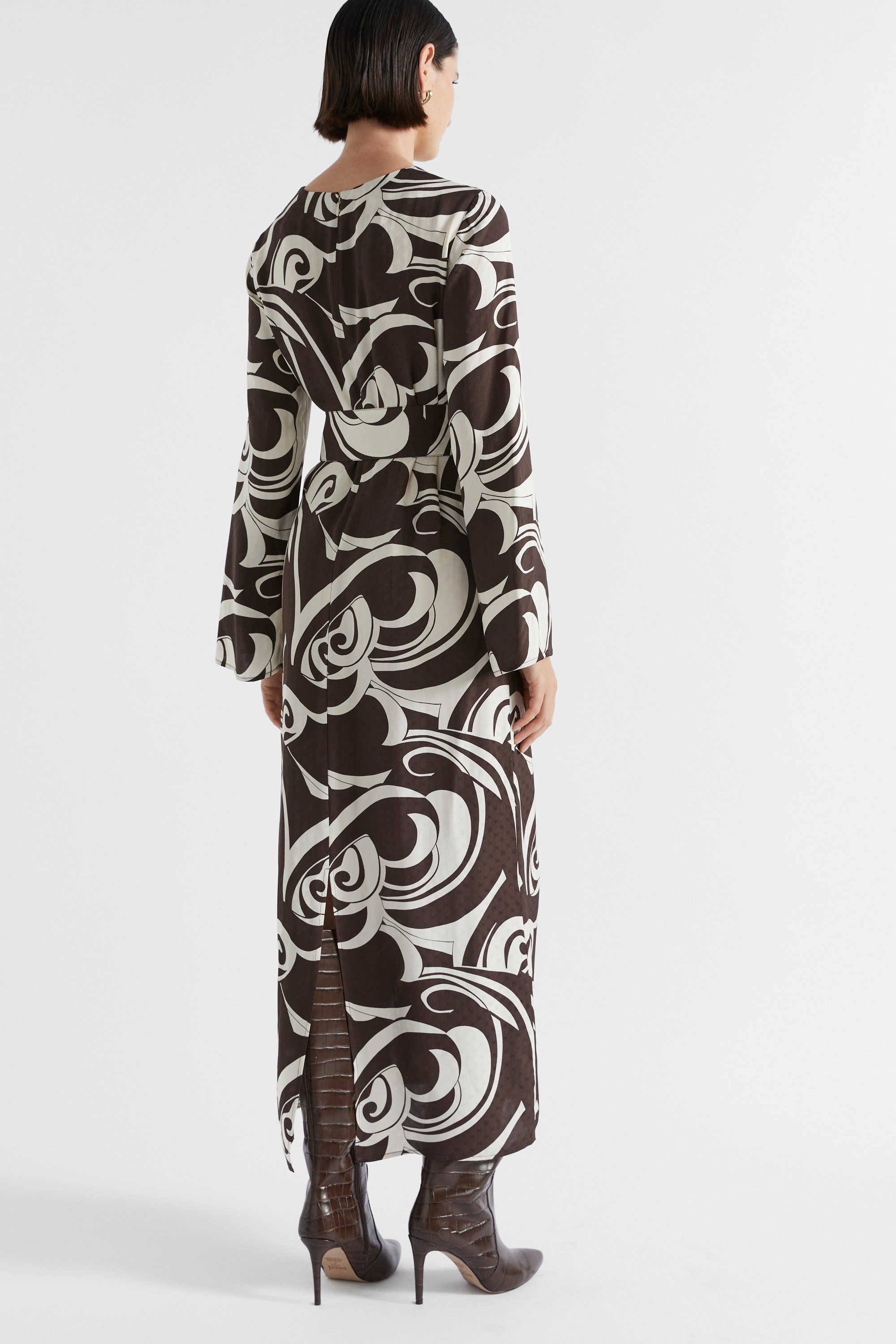 An instant retro-feel outfit, this midi dress is ideal for your next event. It features a round neck, a rear invisible zip, long fluted sleeves, a self-tie with a double ring closure, and a retro swirl pattern. The skirt flares out towards the hem, with a split at the rear for movement.