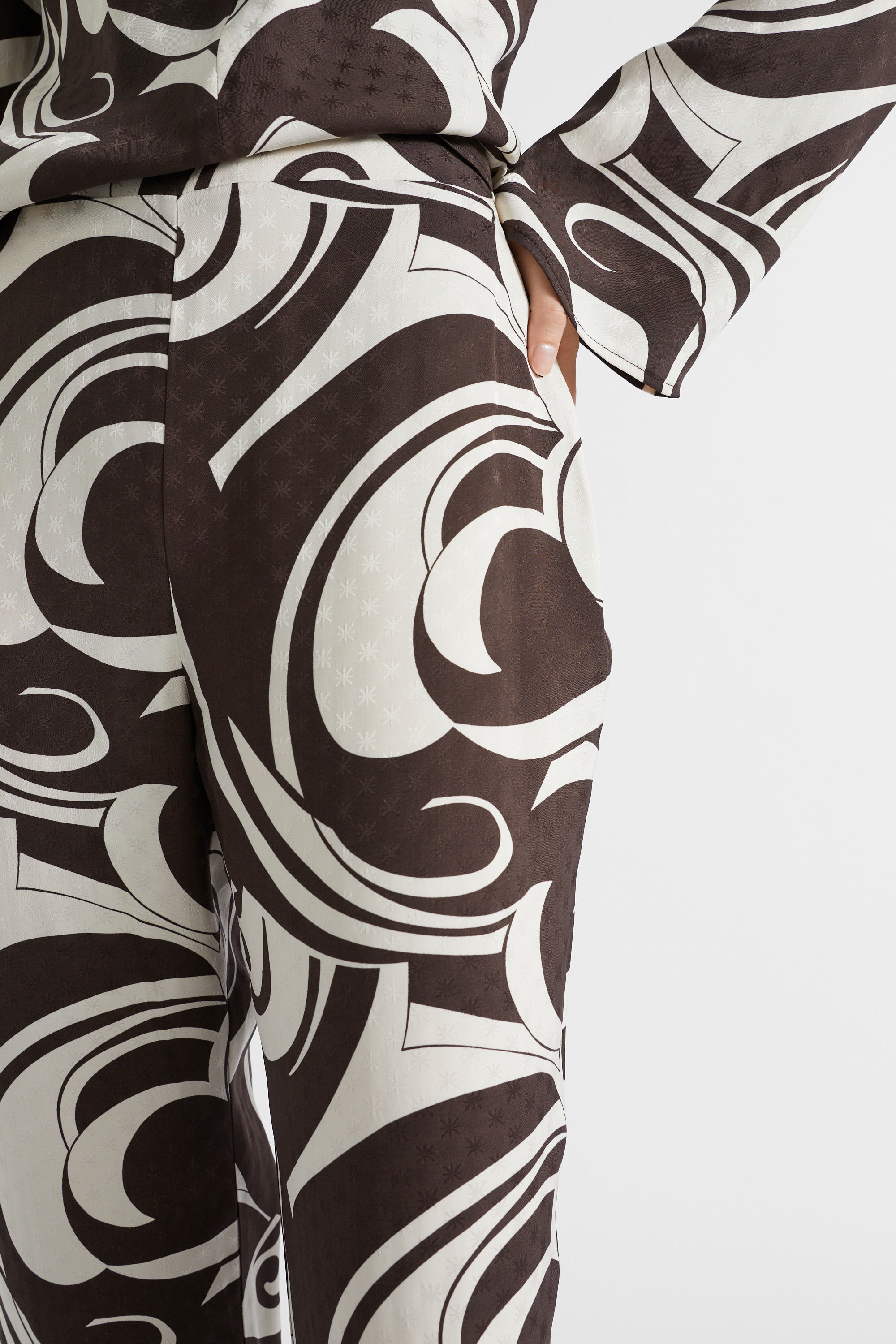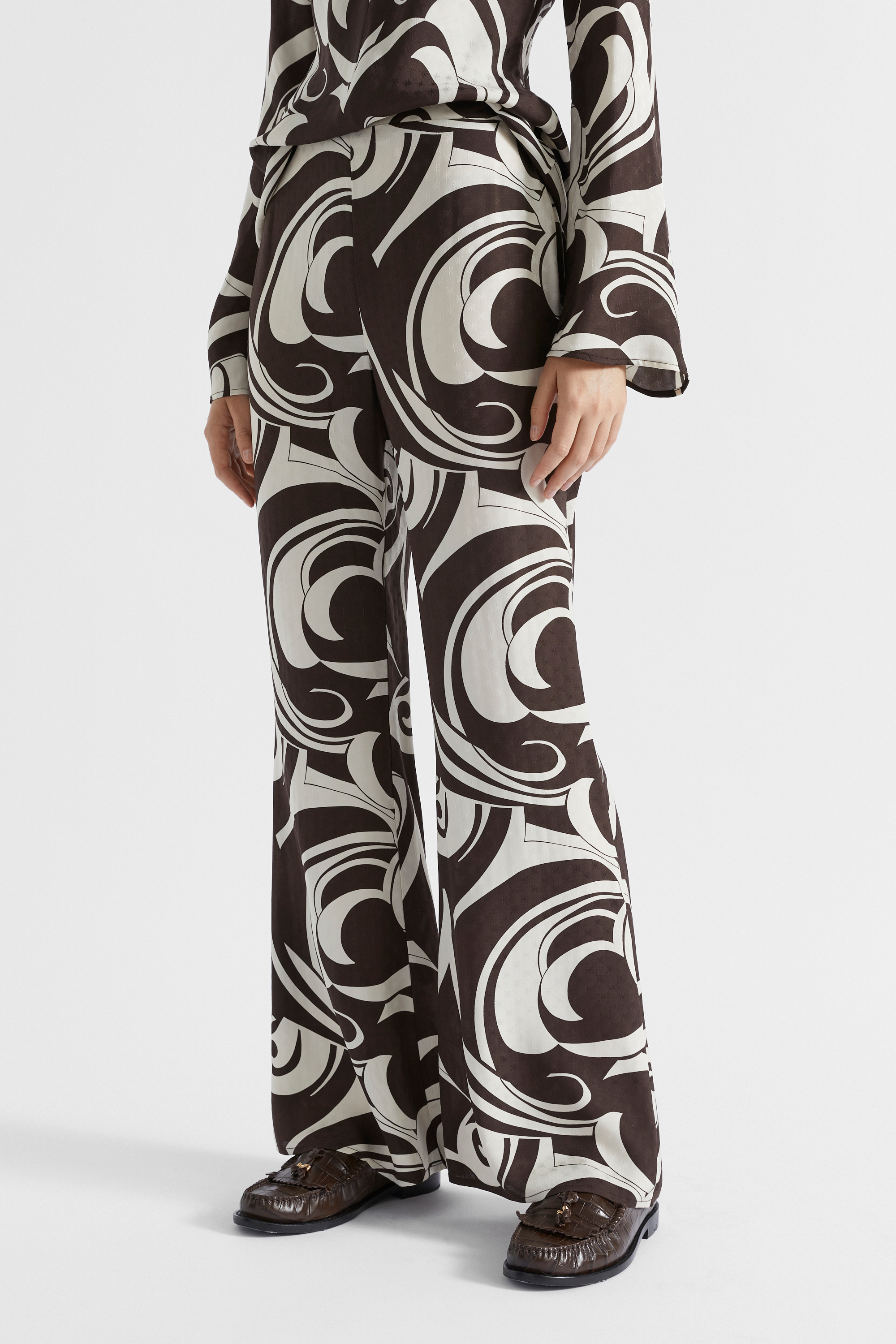 Your next favourite statement pants, these are crafted from fluid satin with a retro swirl pattern. They also have a waistband with an elasticated back, an side invisible zip, and a flared leg shape. Wear them with the matching blouse for an elegant set.