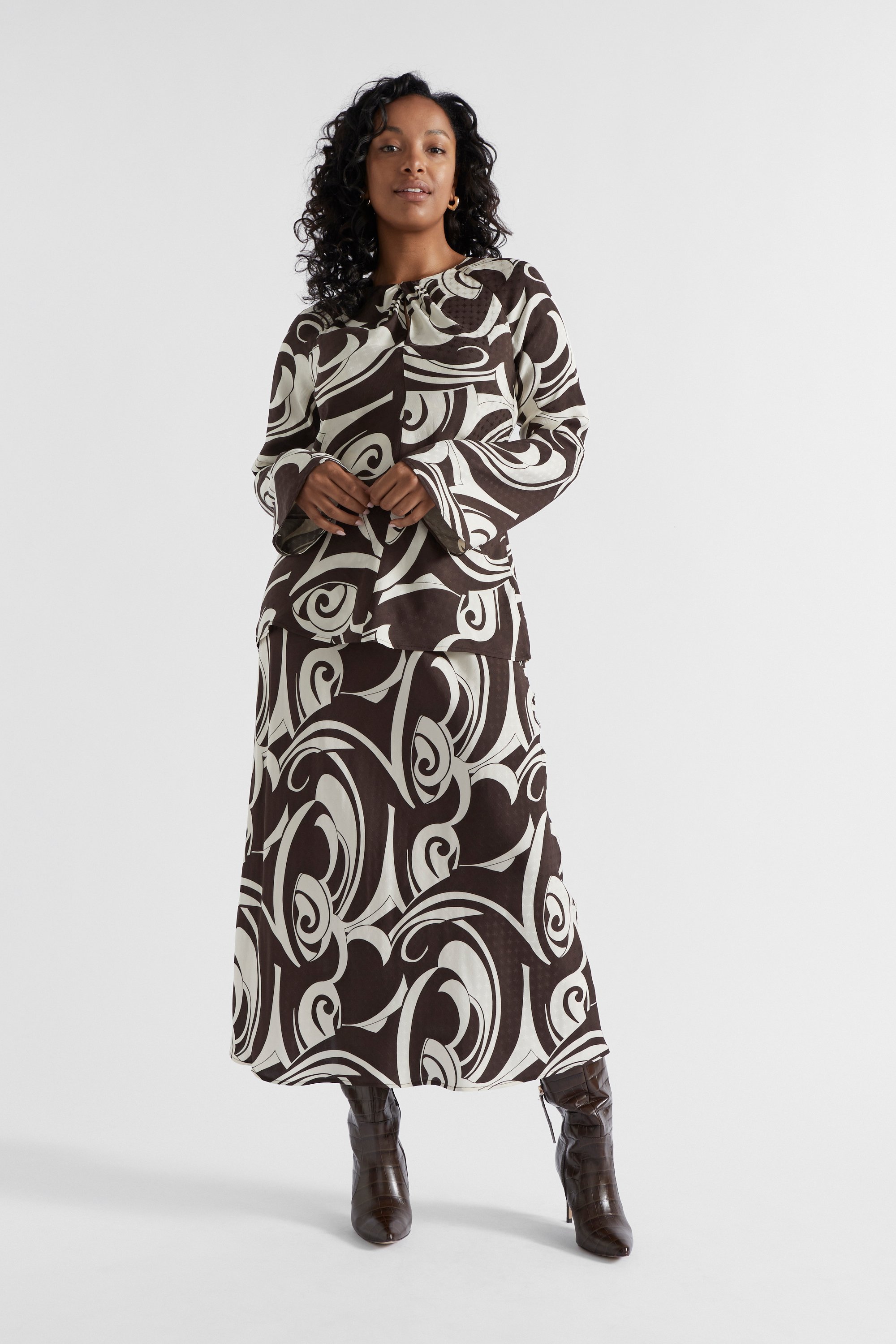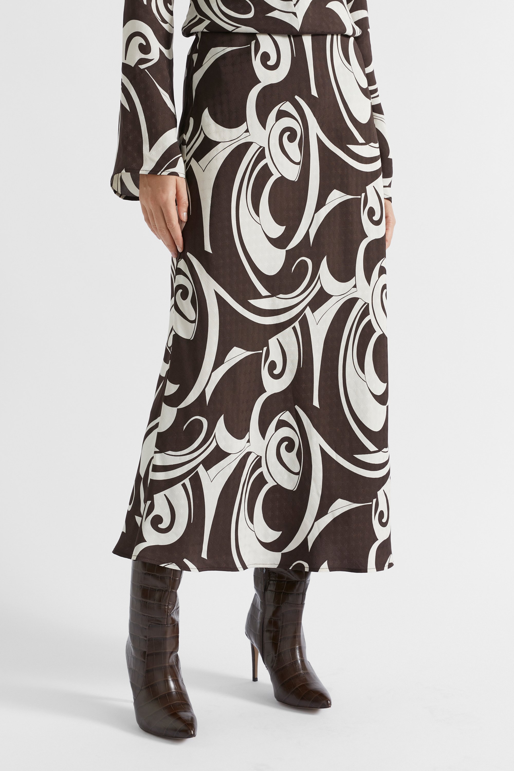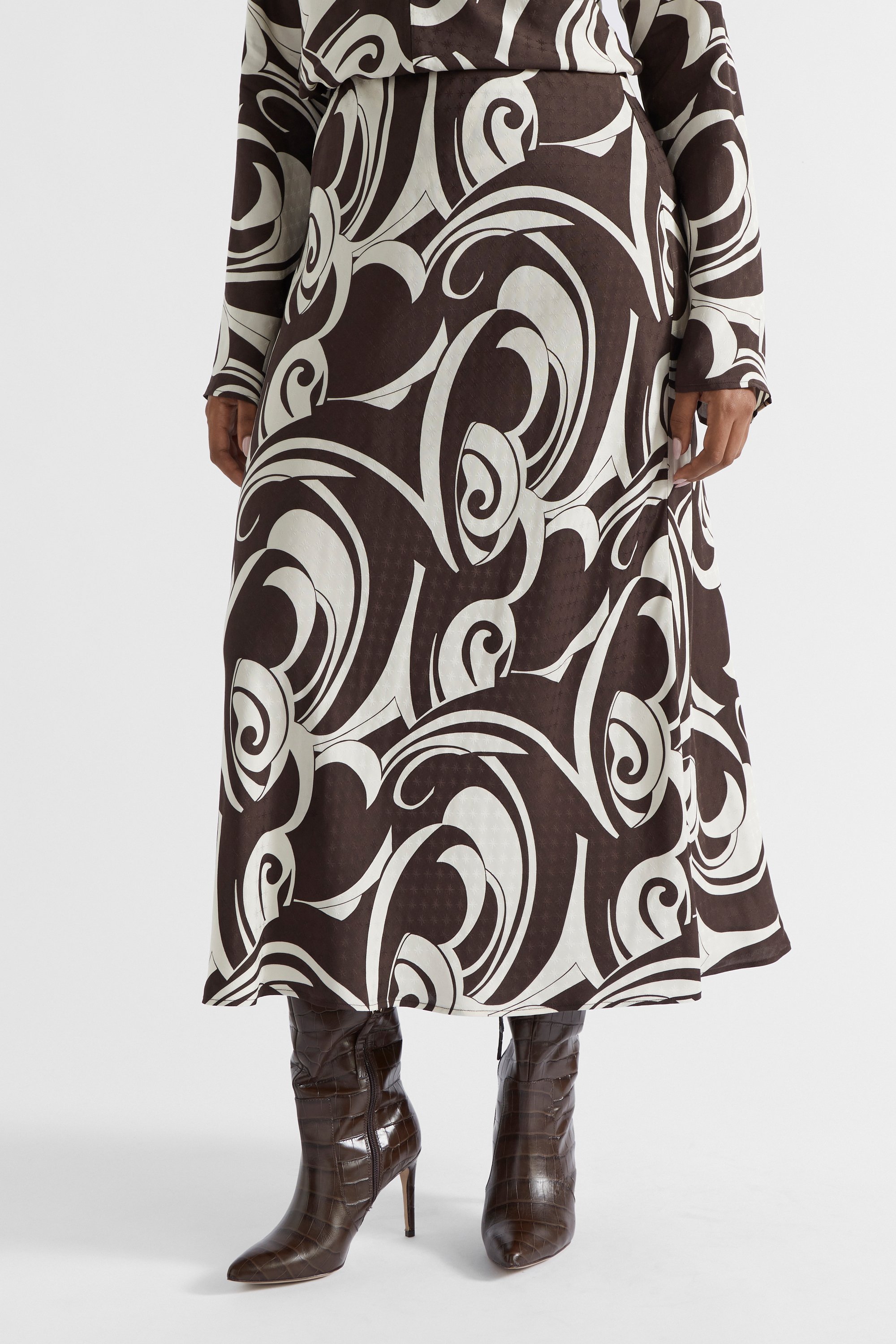 Your next statement piece, this skirt features a retro-style swirl pattern with a jacquard effect. In a versatile slip style with a slight A-line shape, it has elastic at the waistband, and falls to a midi length. Crafted from a fluid satin, it can be paired with the matching blouse for a coordinated look.