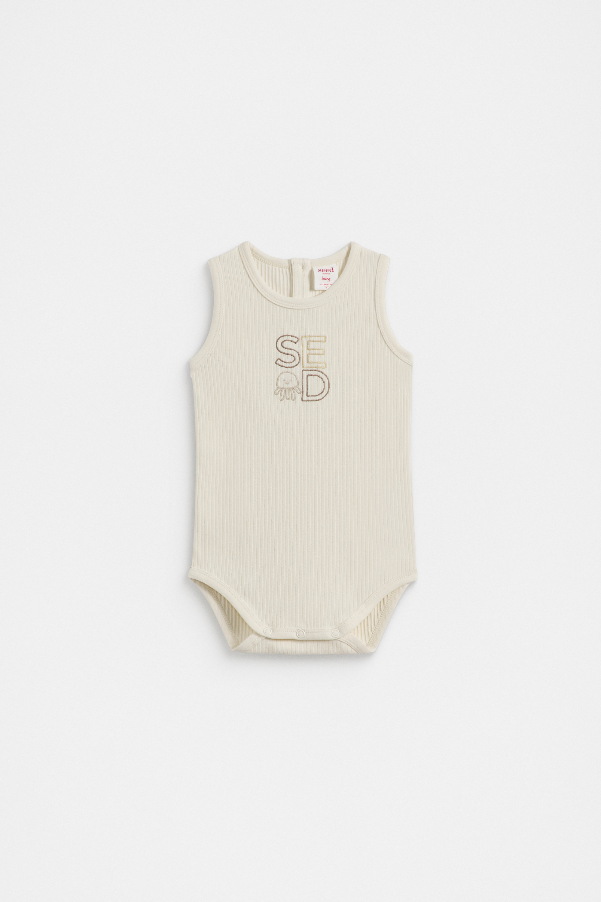 Made from an ultra-soft cotton blend with a rib texture and the perfect amount of stretch, this bodysuit is a must-have for any newborn. It's a sleeveless style with a round neck, and an embroidered Seed Heritage logo and jellyfish design. It fastens with snaps at the neckline and gusset for quick and easy changes.