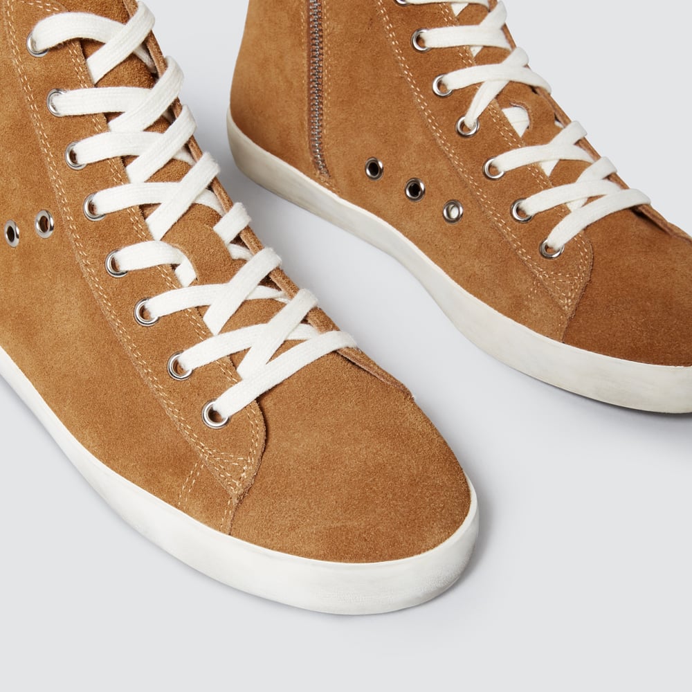 This high-top sneaker features an all-over tan suede design, contrast white laces and rubber sole and eyelet holes for added breathability. Made with a leather upper and a rubber sole, these sneakers are available in tan and in sizes 36 to 41.