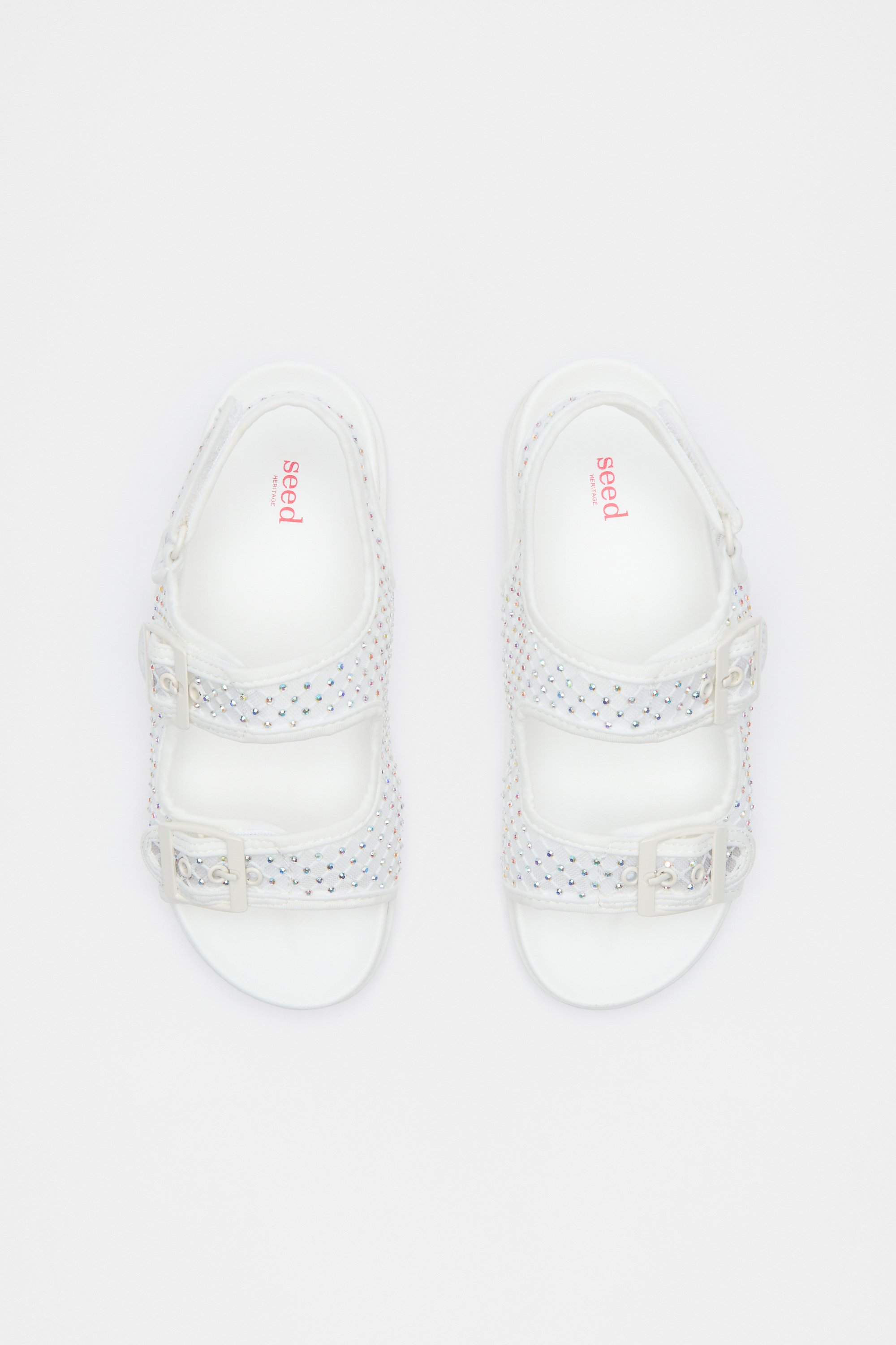 Sparkly and fun, these sandals are finished in a jewel mesh, and feature a double buckle design securing with a hook-and-loop closure around the ankle.