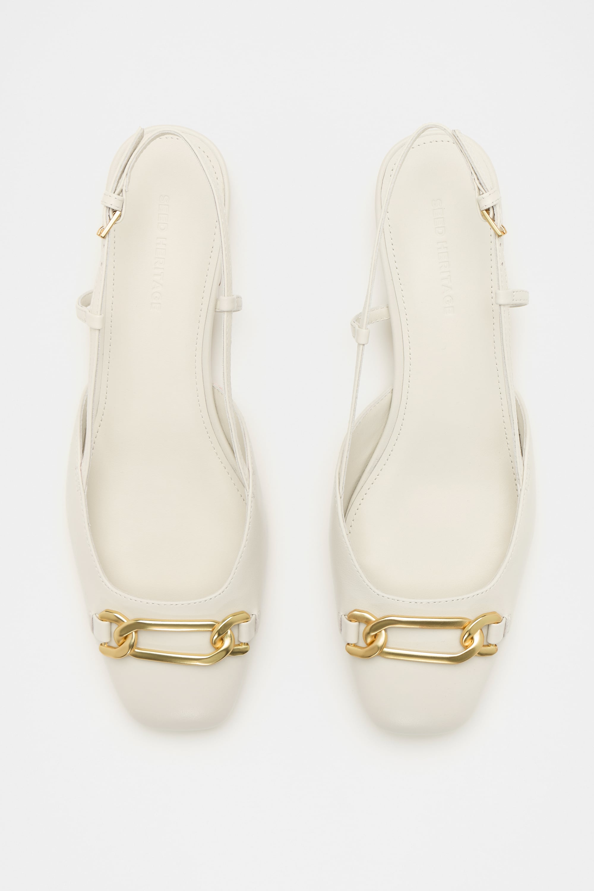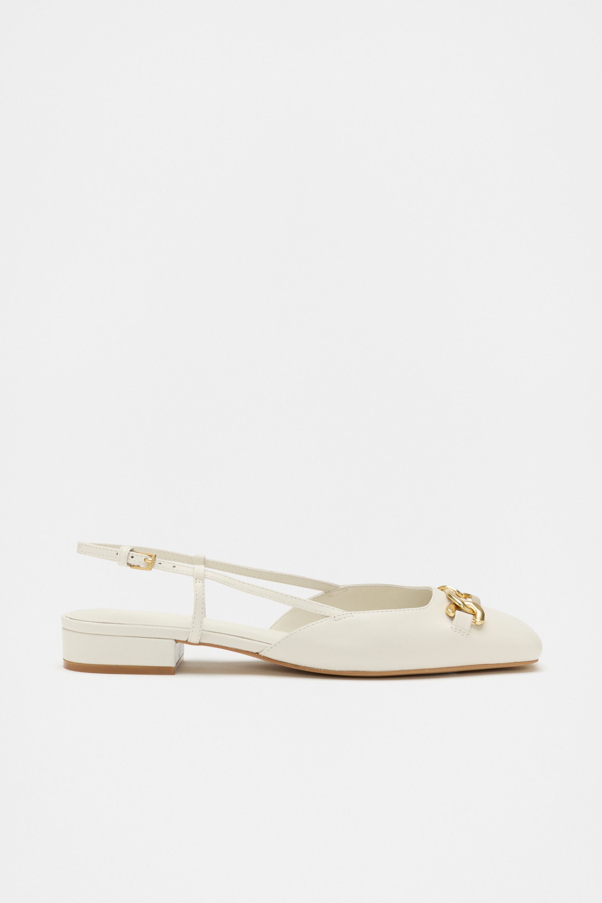 Add a subtle statement to your next outfit with these flats, crafted from premium leather. They feature a slingback style with an adjustable strap, a rounded toe, coated hardware, and a chain detail.