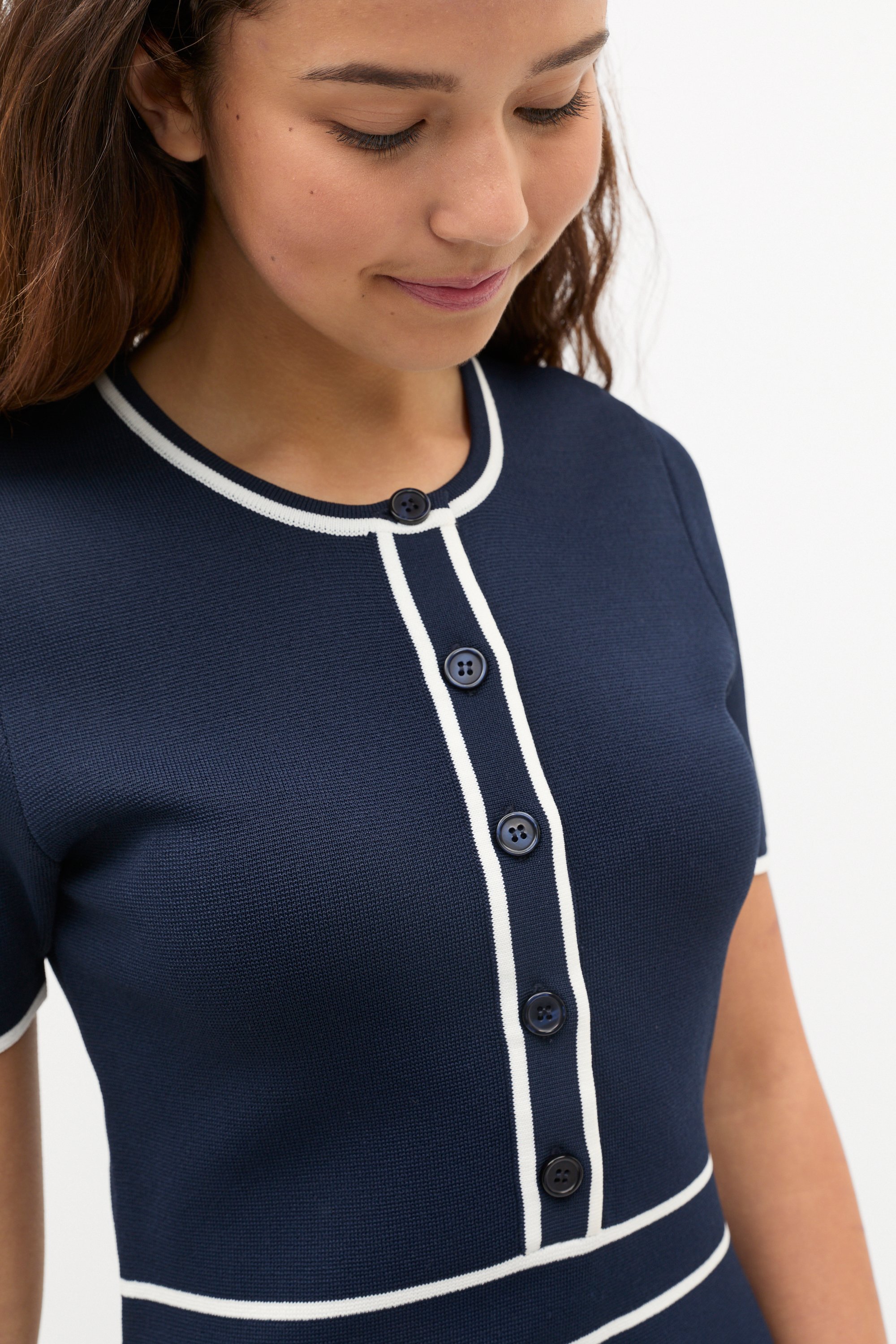 Sophisticated and chic, this dress is an effortless head-to-toe style. It features a round neck, short sleeves and falls to a mini length with an A-line skirt. It has contrast piping, decorative buttons and a knit finish.
