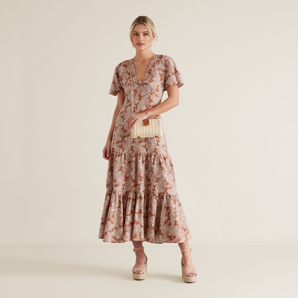 Celebrate summer with this Knot Detail Tier Dress. Detailed with a Washed Apricot paisley print, it features a V neckline, flutter sleeve, knot front bodice and longline tiered skirt. For your reference, our model wears a size 8 and is 177cm tall. Check the label inside of the garment for care information.