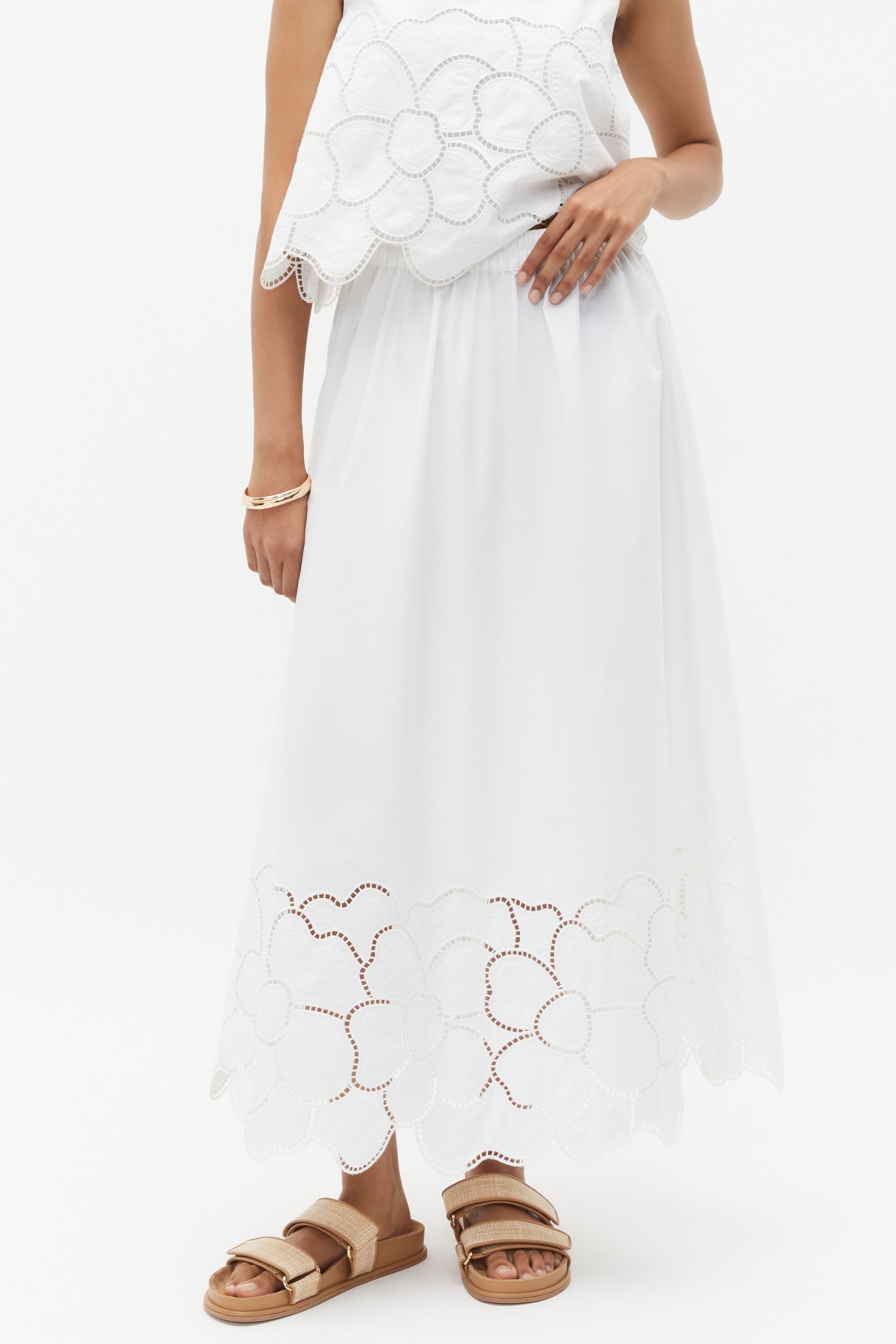 Add a little something extra to your summer styling with this skirt, elegant by design. Crafted in premium cotton, it features an elasticated waist, a broderie trim and falls to a maxi length. Pair with the accompanying broderie styles for a curated feel. By choosing our cotton products you're supporting our investment in Better Cotton's mission. This product was sourced via a system of mass balance and therefore may not contain Better Cotton.