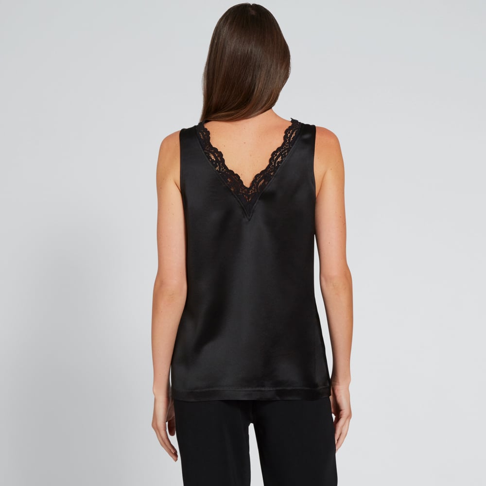 This elegant cami is a chic piece for evening. Combining a lace-trimmed plunging V-neck with a sumptuous hand-feel and ultra-flattering cut, it will elevate a simple black pant or tailored short with stylish aplomb. Made from acetate/polyester, this piece is available in Black and in sizes 6 to 14. Please wash as per care instructions found on garment. Our model wears size 8 and is 179cm tall.