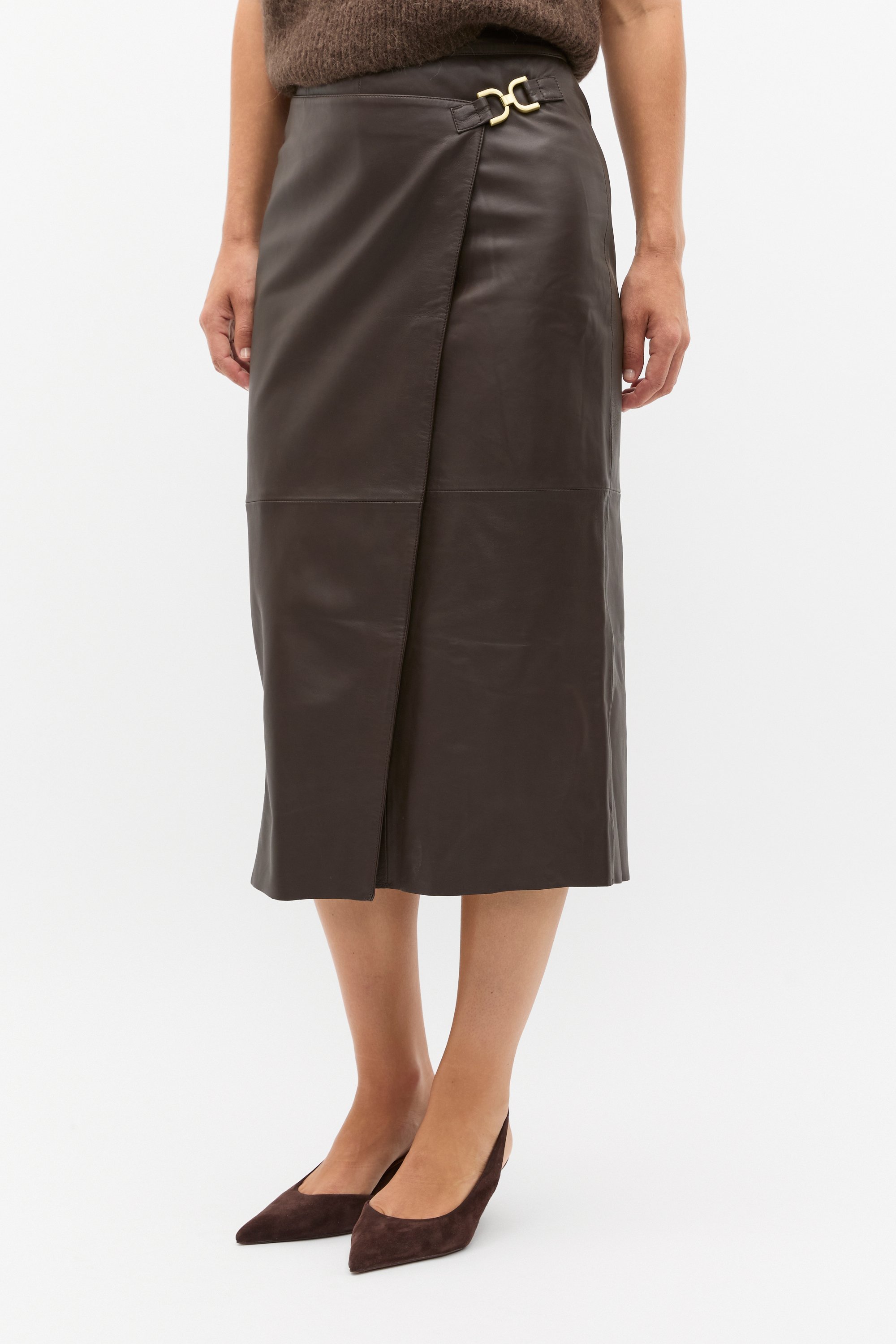 A statement option to update your evening wardrobe, this skirt has the details you'll love. Crafted in premium leather, it features a wrap front with a gold-tone buckle detail, a fixed waistband with a rear zip and falls in a column shape. It's fully lined for a comfortable fit. As a proud member of Leather Working Group, Seed supports their mission of greater transparency and continuous improvement, helping to create more responsible leather production. For more information, please visit Leather Working Group.