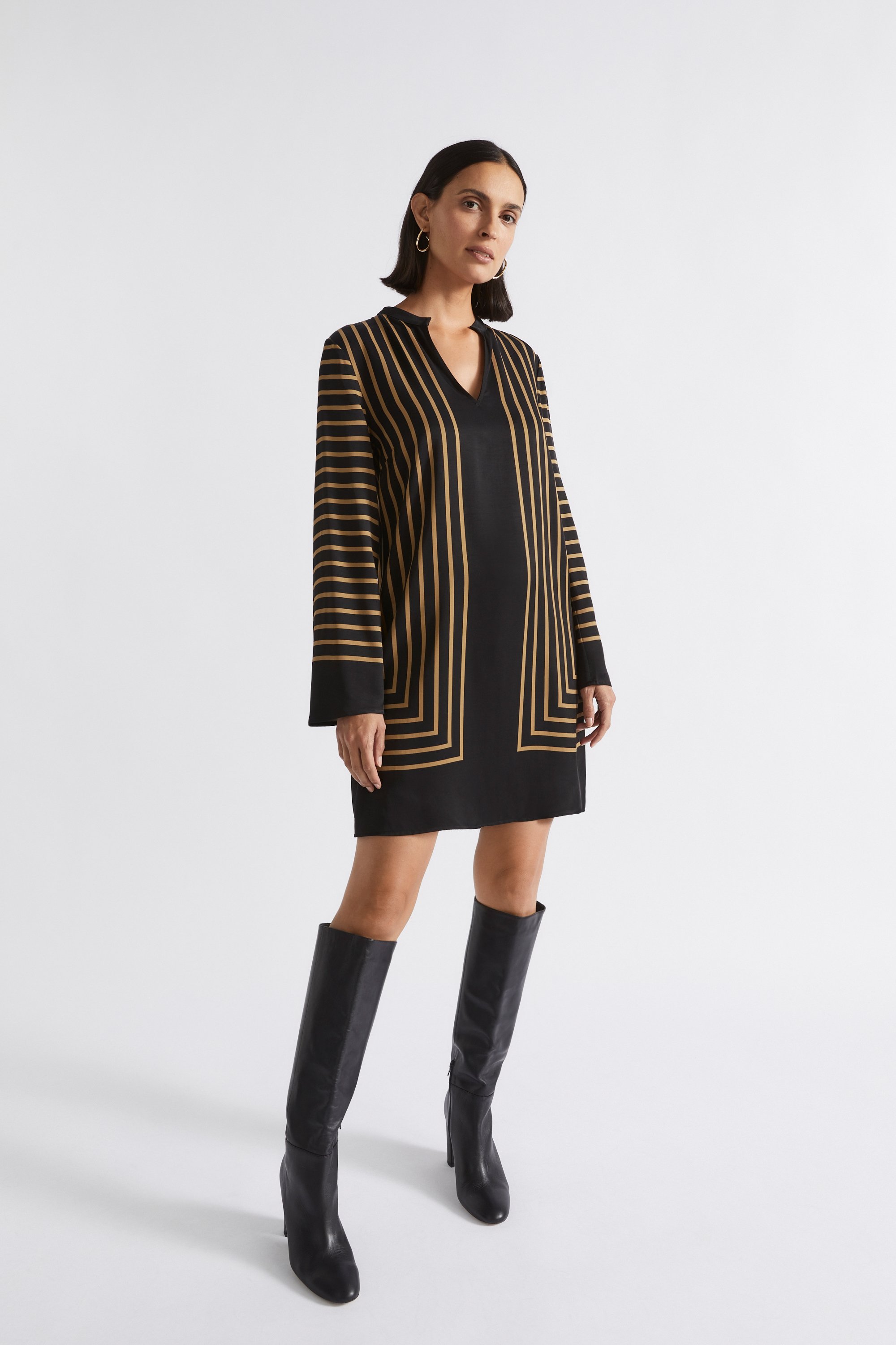 With a standing collar and a classic shift shape, this dress is a work-week staple. Its linear print gives it a modern feel, while its mini length is balanced by long sleeves.