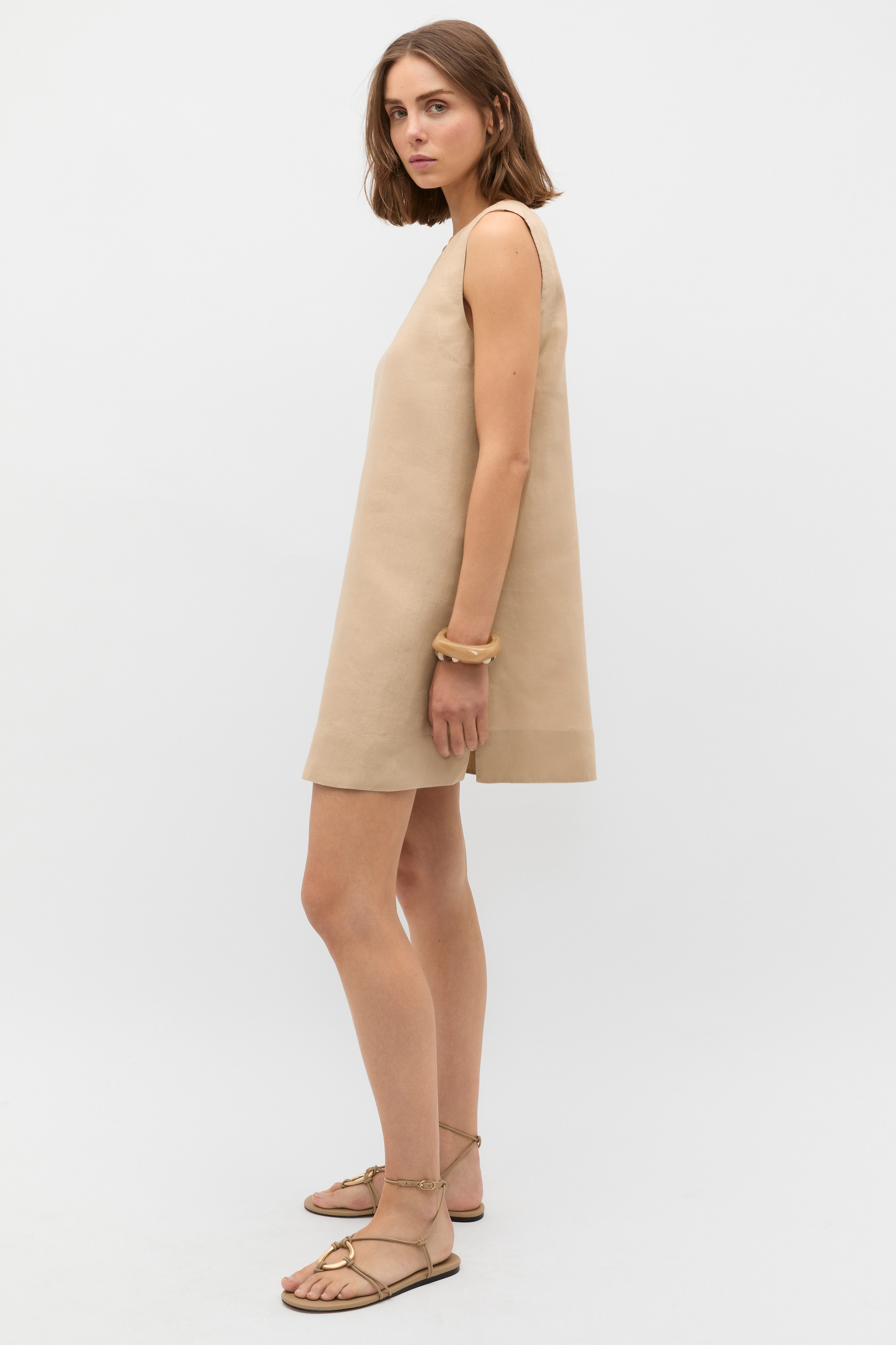 A stylish update on our bestselling dress, this simple linen mini is a must-have in your wardrobe refresh. Crafted in premium linen, it features a round neck and falls to a chic mini length. Secures with a button at the back of the neck.