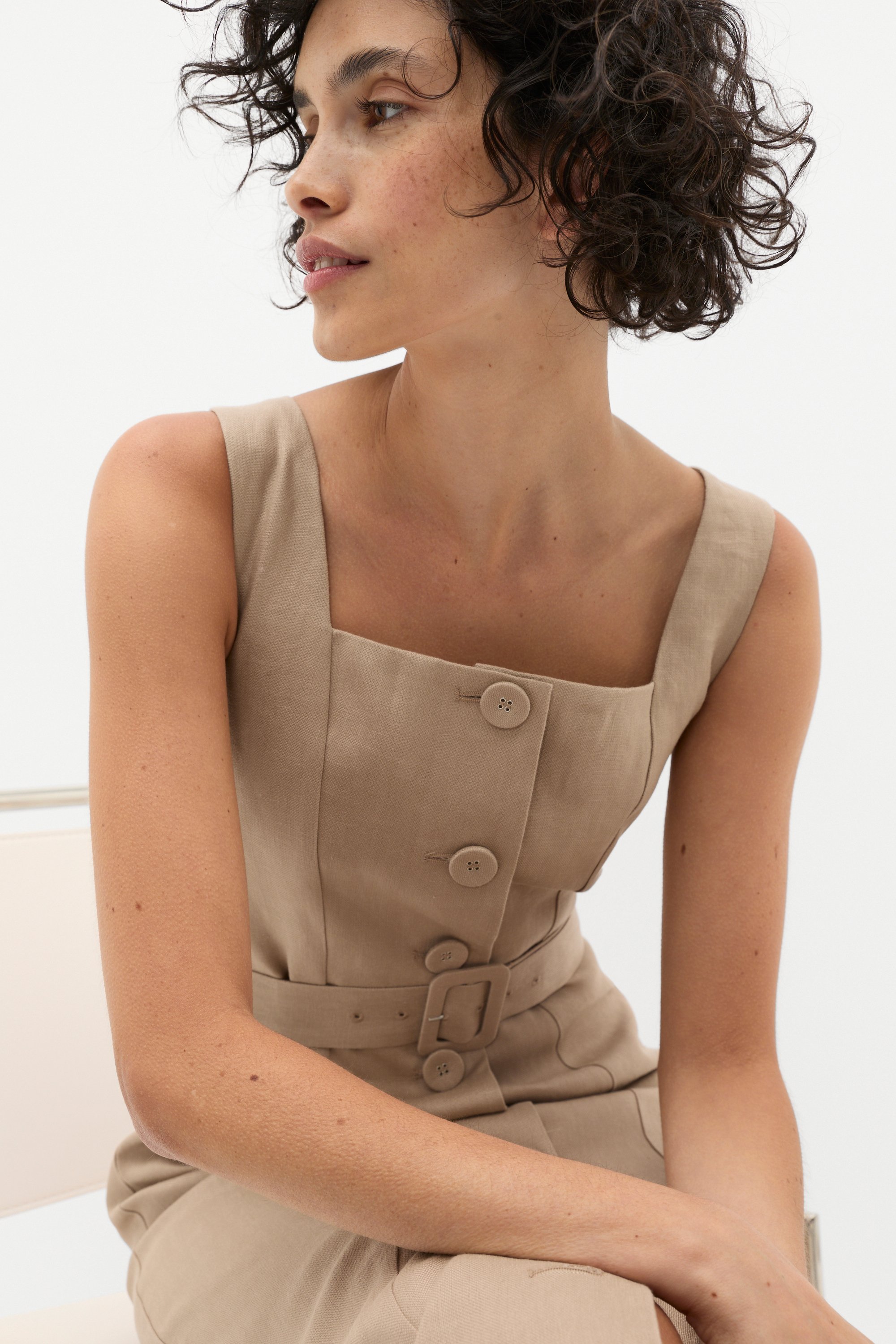 Crafted in premium linen in a timeless design, this dress offers easy elegance. It features a straight neckline, thick straps, a button-through front and is finished with a belt for a structured fit around the waist. This dress features a heavier weight linen, perfect for the your transeasonal wardrobe.