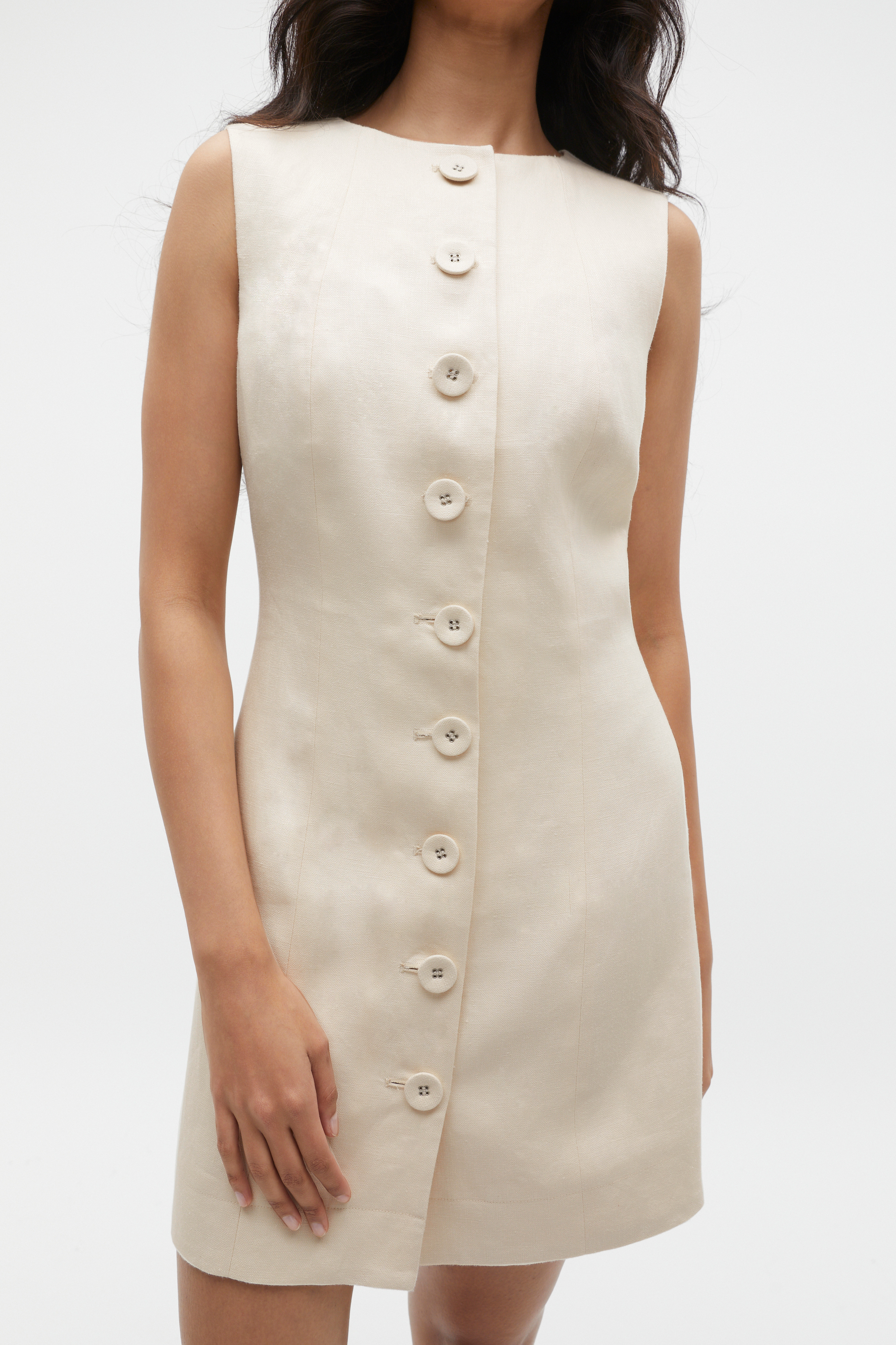 A chic, versatile option for your wardrobe, this mini is crafted from premium linen made with French flax. This fully lined style features a wide neck, sleeveless construction, a statement button front, and seam details.