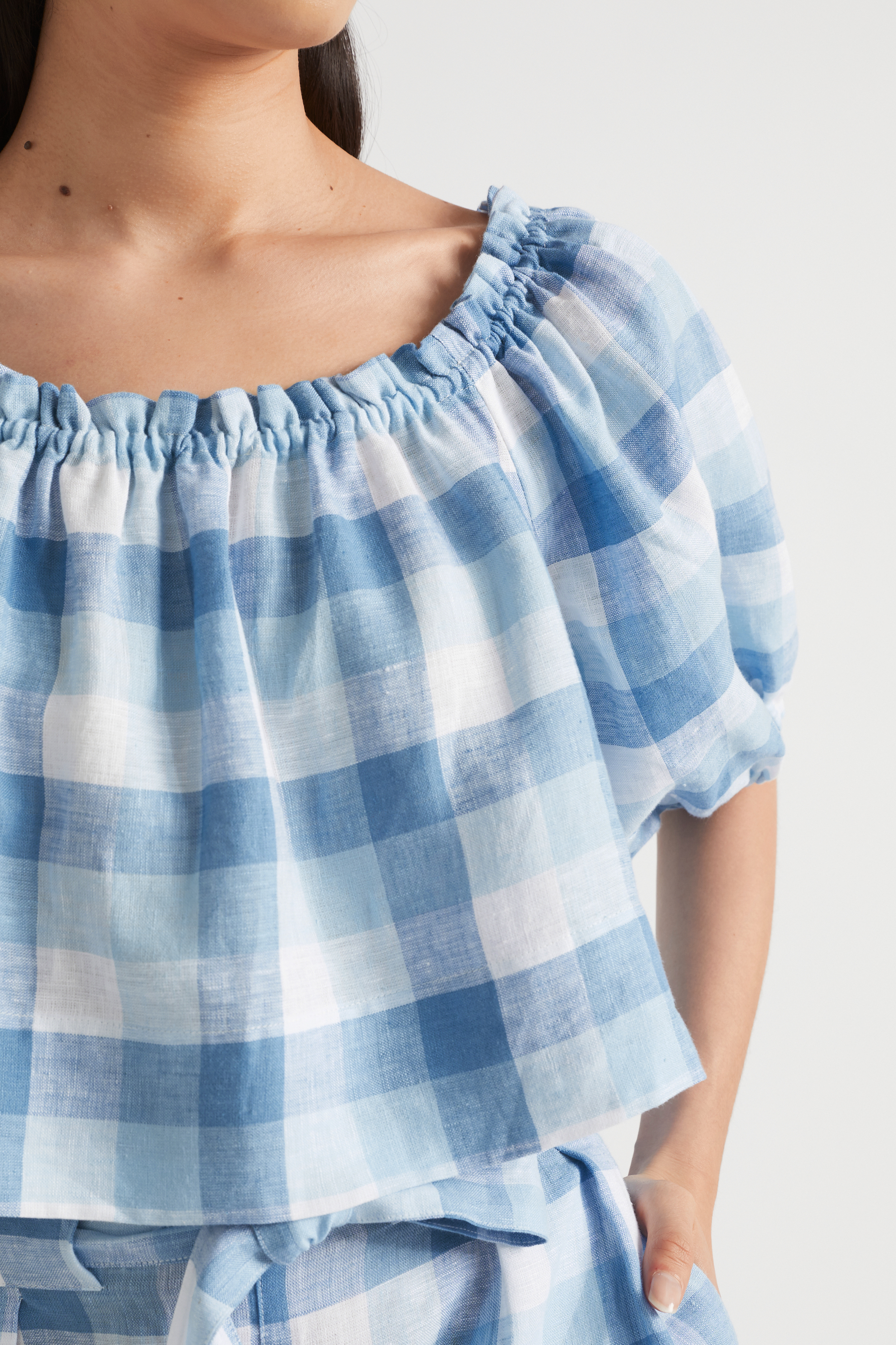 With puff sleeves and a swing fit, this top is casual and easy while still making a statment. The top is crafted from premium French linen, featuring a classic check pattern.
