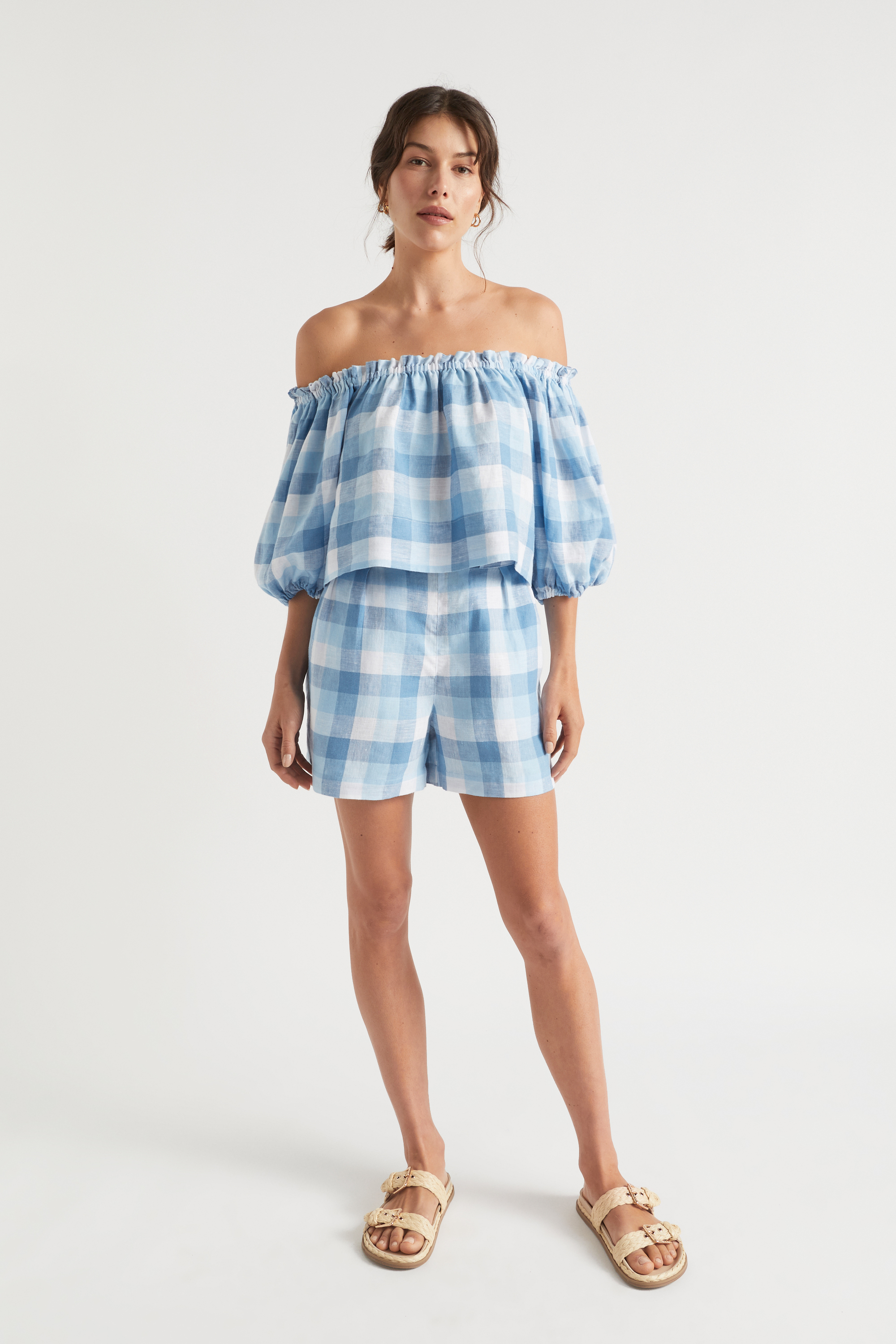 In a tonal blue check and crafted from premium French linen, these shorts are a summer staple. They feature a self-belt tie at the waist, and have a mid rise and a classic fit through the leg. The shorts have hip pockets.