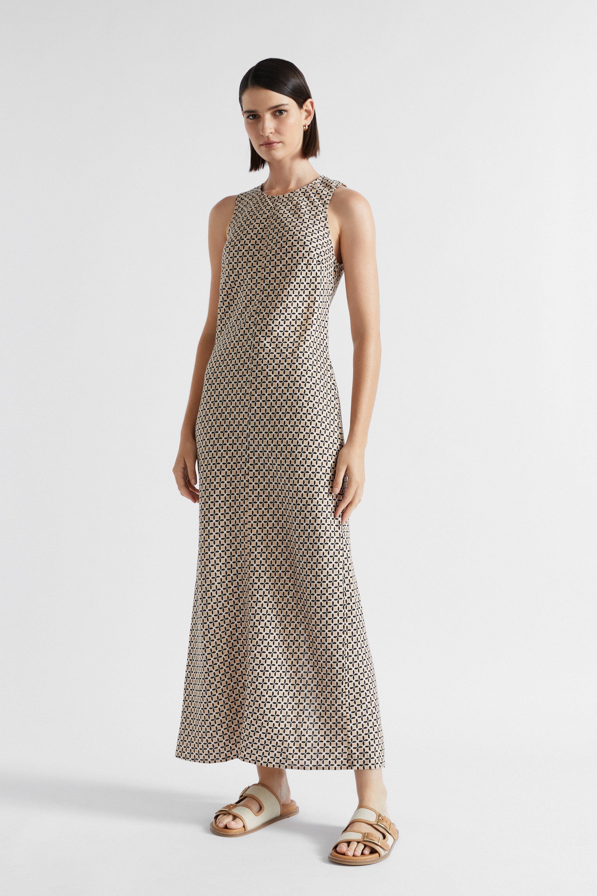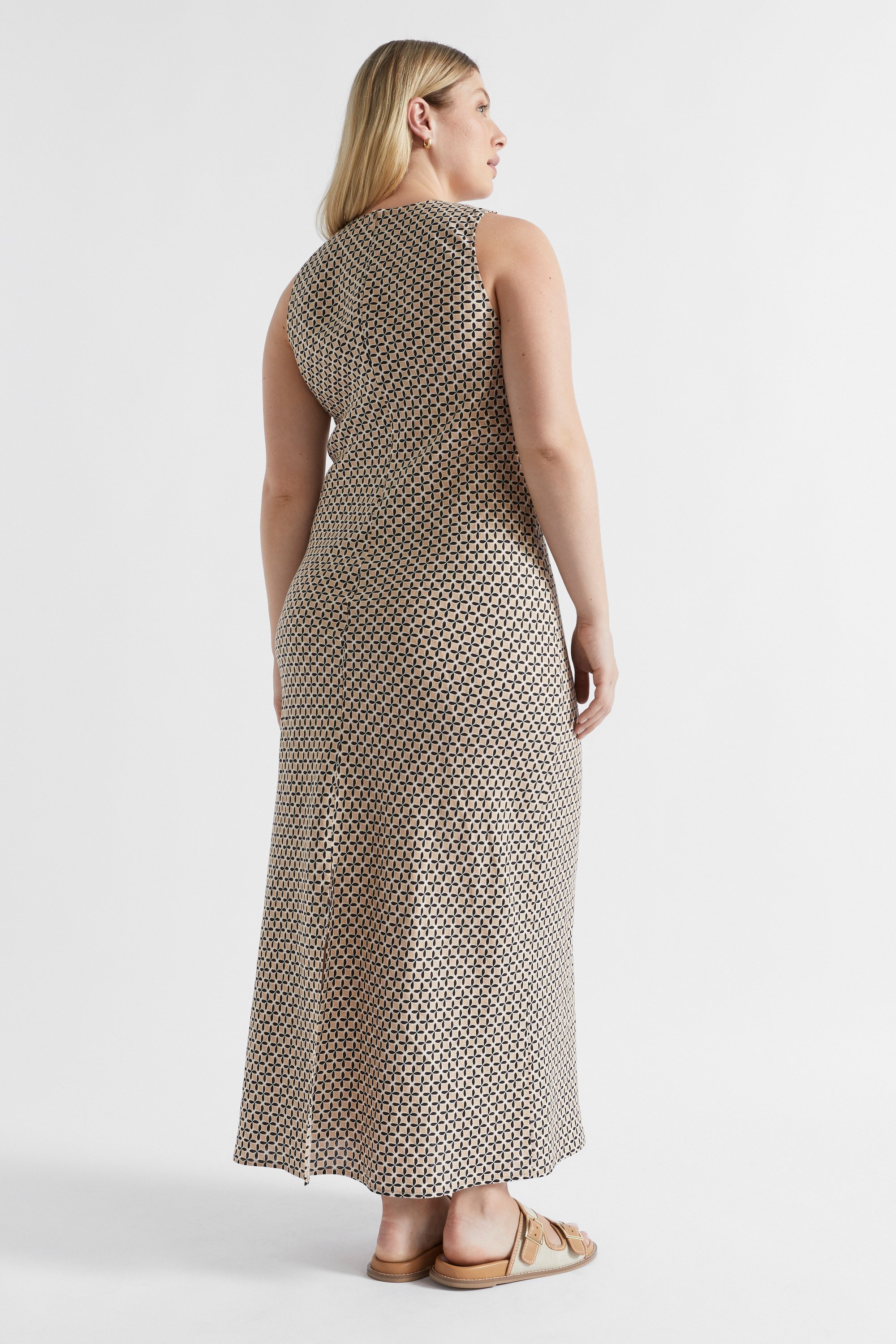 Crafted from premium French linen in a wearable geometric print, this midi dress is an ideal addition to any wardrobe. It features a round neck, sleeveless construction and an invisible zip and hook and eye closure.