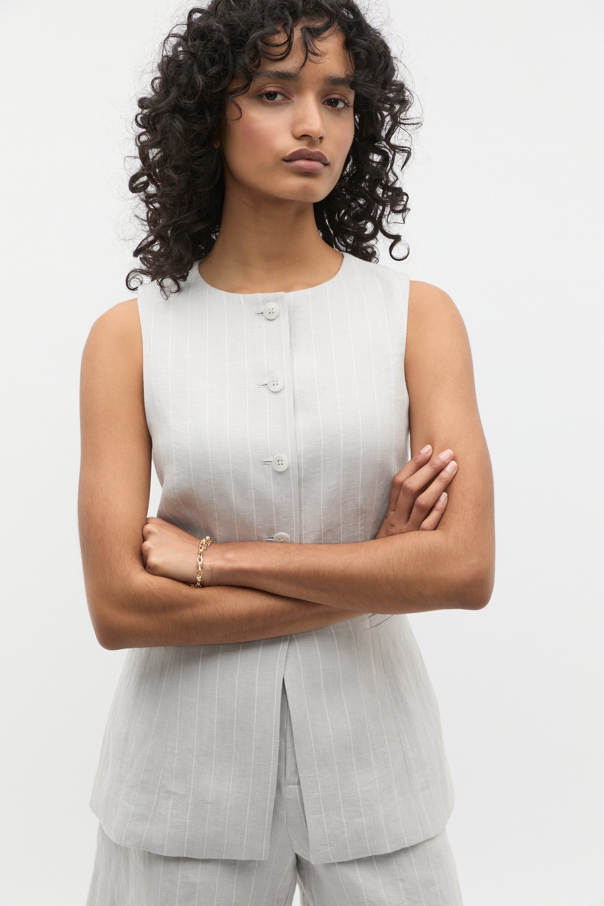 Chic and flattering, this pinstripe vest offers a touch of elegance to your holiday wardrobe. Crafted in premium linen, it features a round neck, a button-through front and a longline cut.