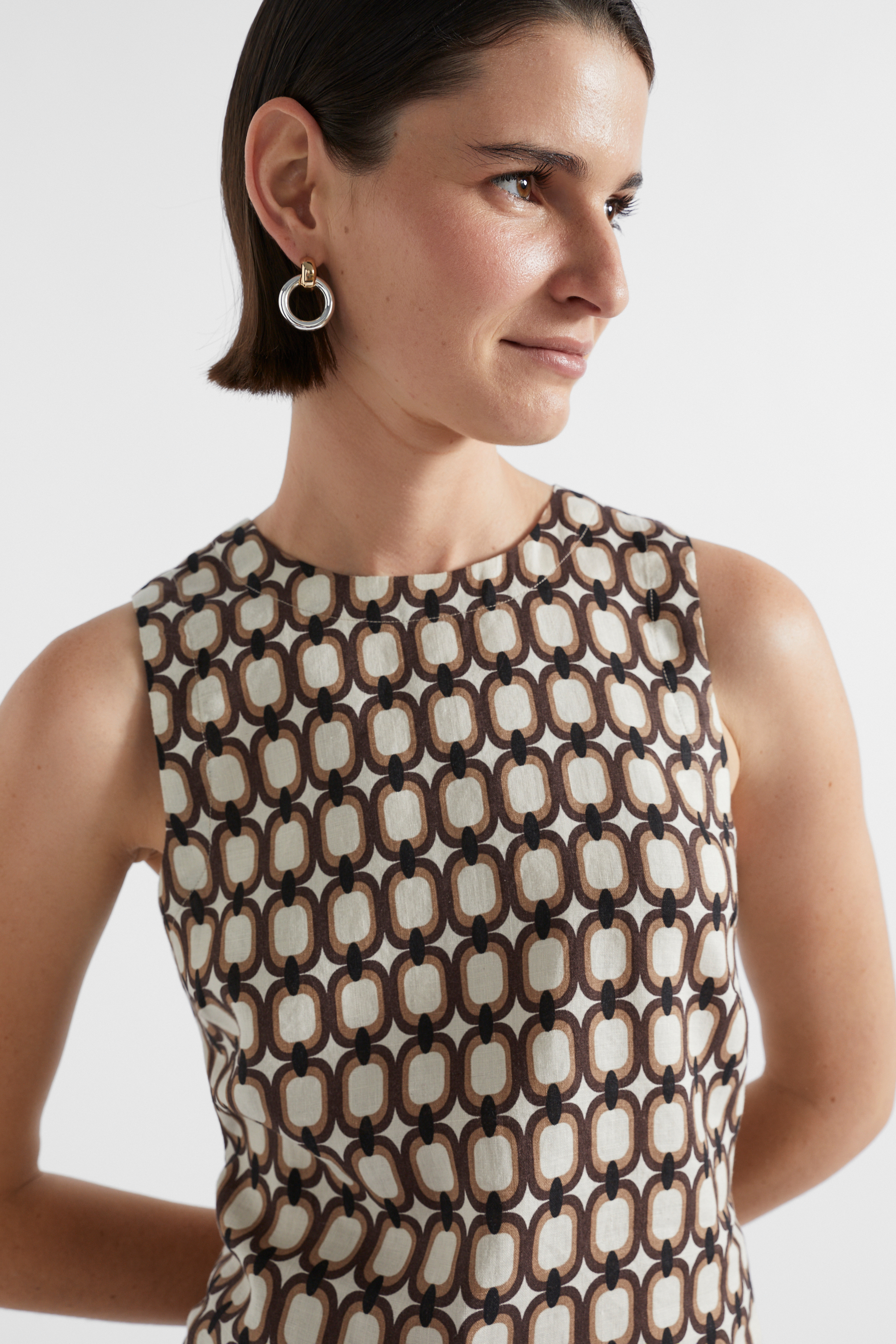 Ideal for your next warm getaway, this tunic top is crafted from premium breathable linen. It features a curved neckline, sleeveless construction, and a slight fit-and-flare shape with splits at the hem. With a tonal geometric pattern, it's an easy-to-style statement piece.