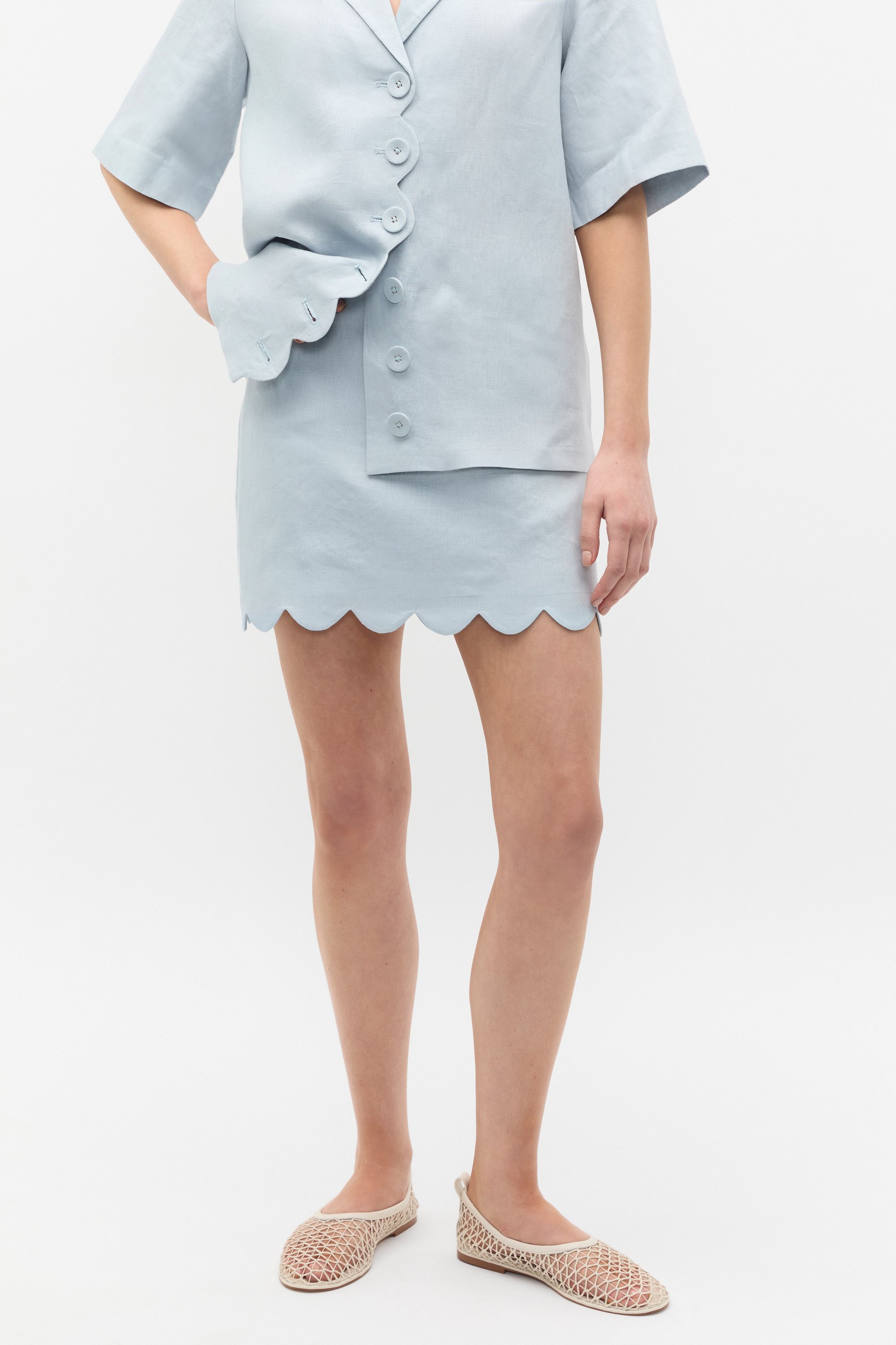 Sophisticated in its simplicity, this skirt features a scallop trim design for an elevated look. Crafted in premium linen, it features a fixed waistband, a straight shape and a mini length. Style with the coordinating scallop trim shirt for an effortlessly chic set.
