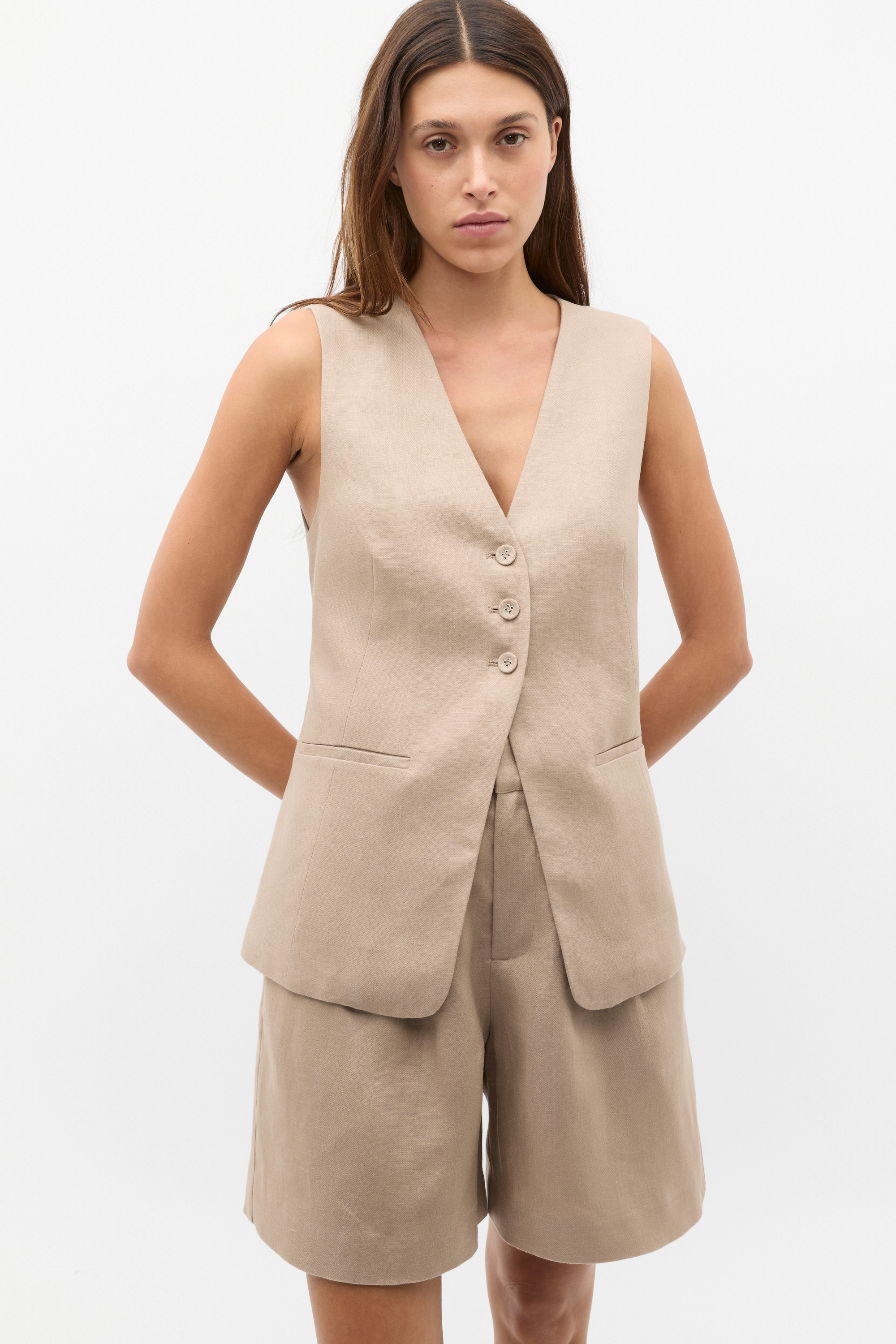 Crafted in a heavy weight linen with a refined finish, this vest is a chic option for your workwear looks or casual days. A sleeveless design, it features a V-neck with a button up front, welt pockets and a tailored finish.